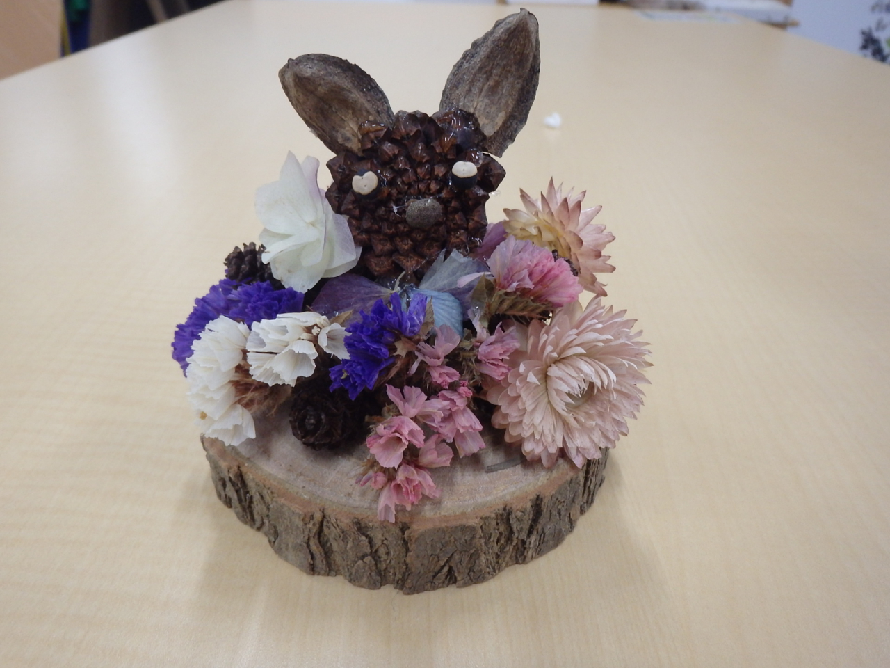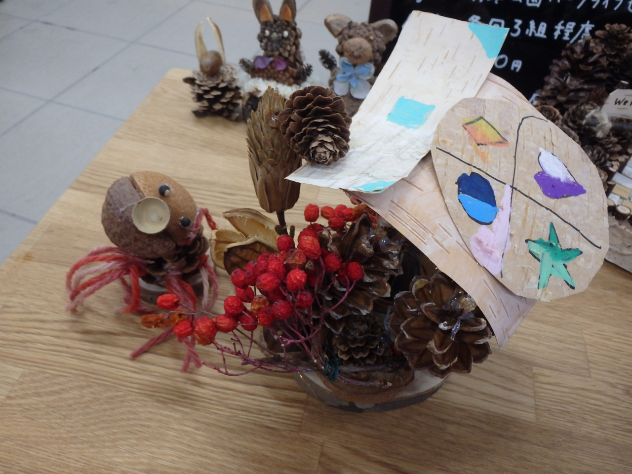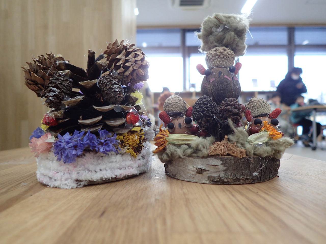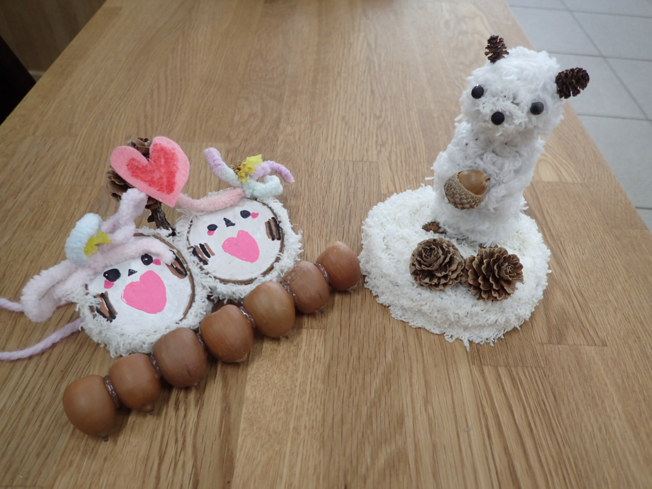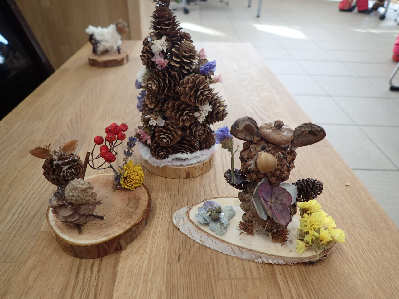 1月は「木の実で自由に作ってみよう」直径8cm程の木の輪切りに、木の実や