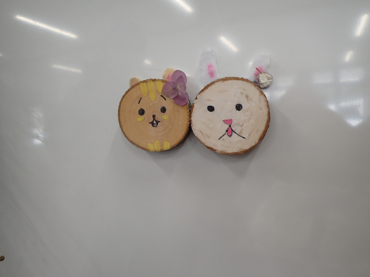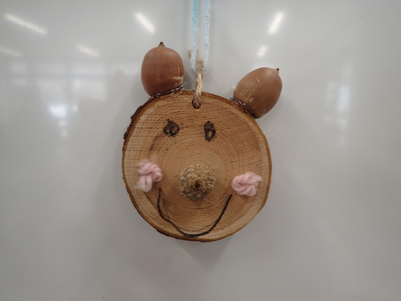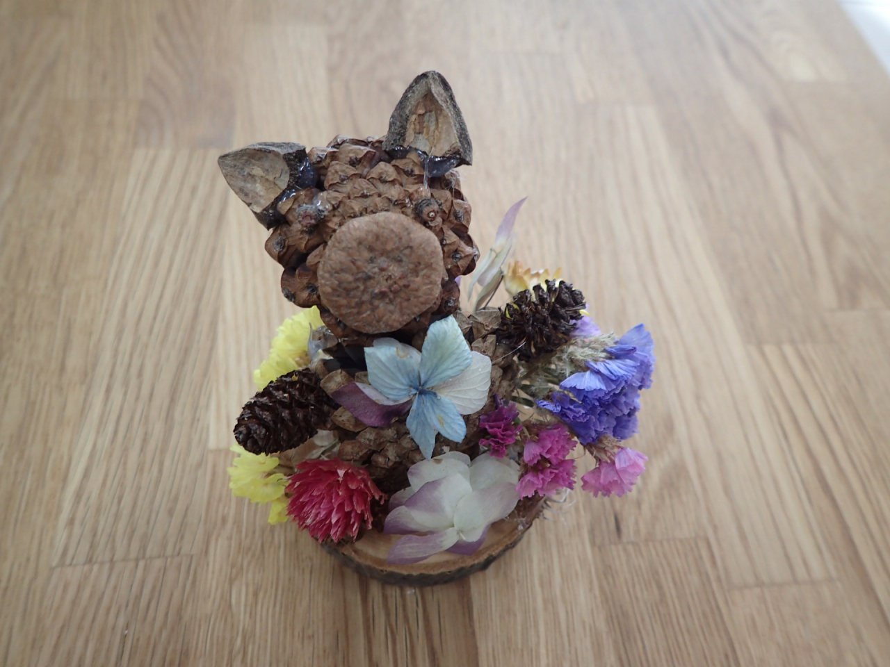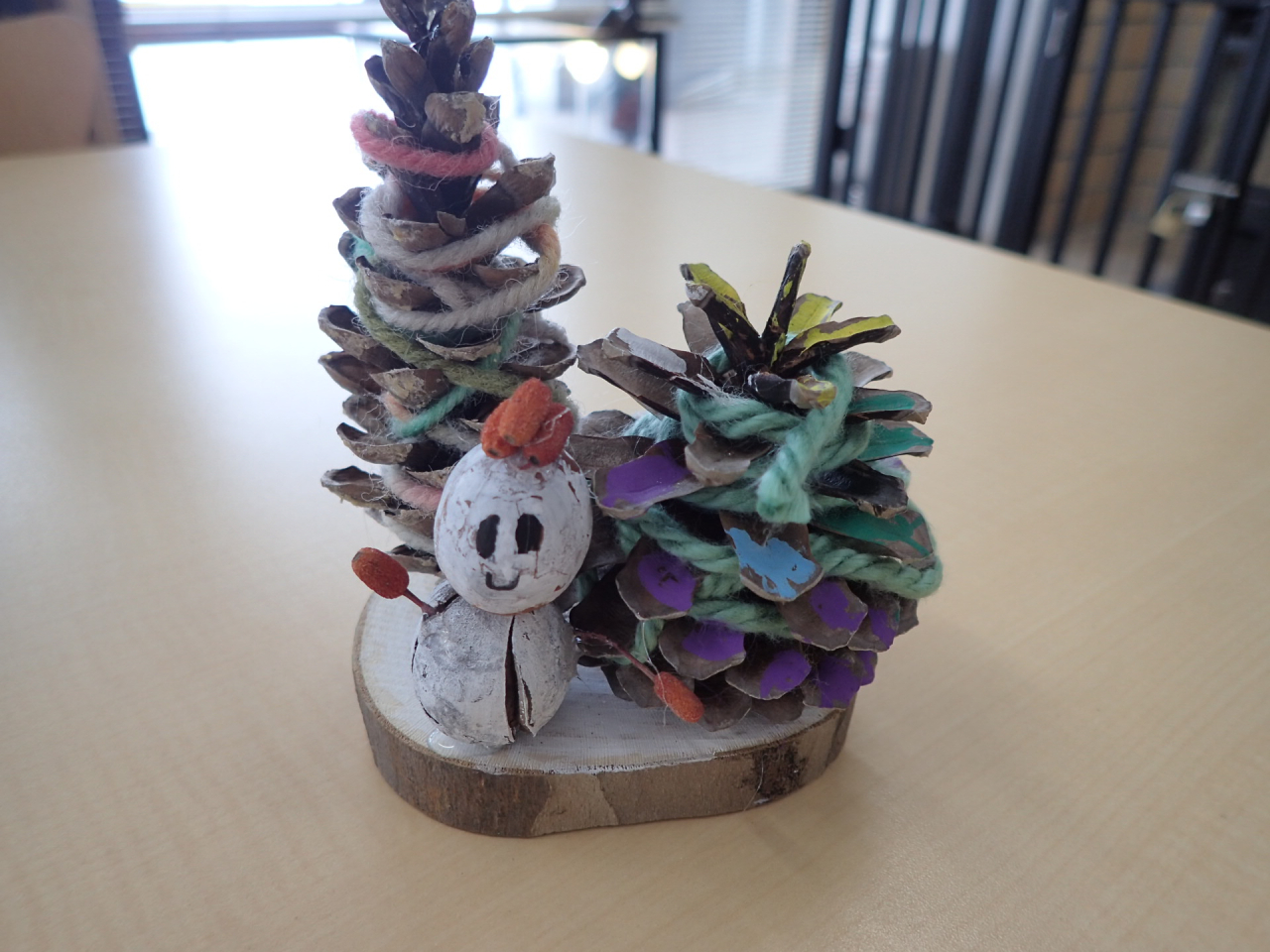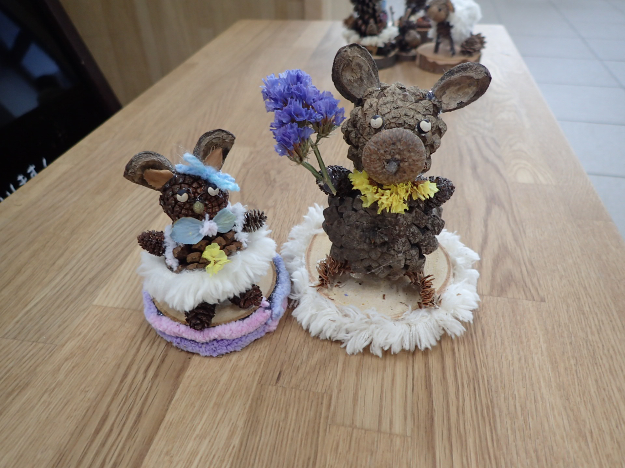 1月は「木の実で自由に作ってみよう」直径8cm程の木の輪切りに、木の実や