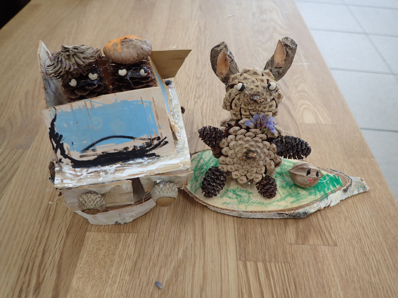 「木の実で自由につくってみよう」。最初は悩みながら「何作っていいかわかんない!」