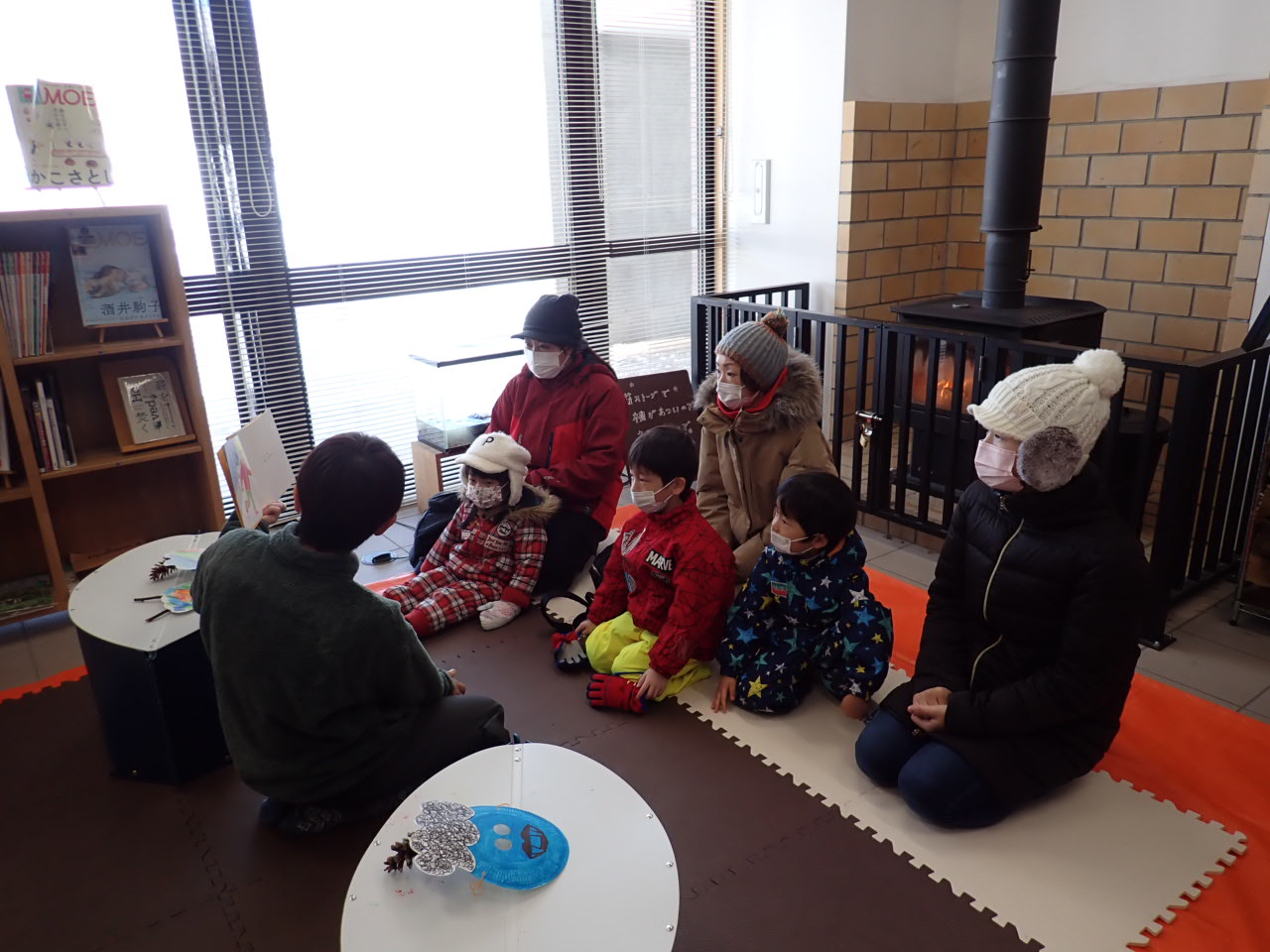 パークライフセンターの薪ストーブにあたりながら、手遊びや絵本を楽しんだ後、
