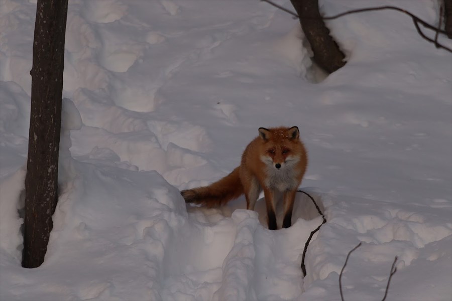 少し雪が溶けて黒ずんでいる場所があったら、キツネがお気に入りの、くつろぎスポットかもしれません。足あとも手掛かりにして、探してみてくださいね。