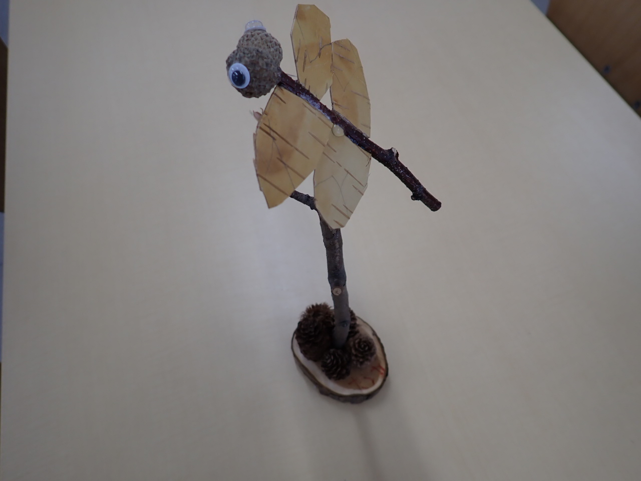 白樺の皮で羽を表現したトンボや、ちょっと悩みながら可愛く完成したカタツムリ。