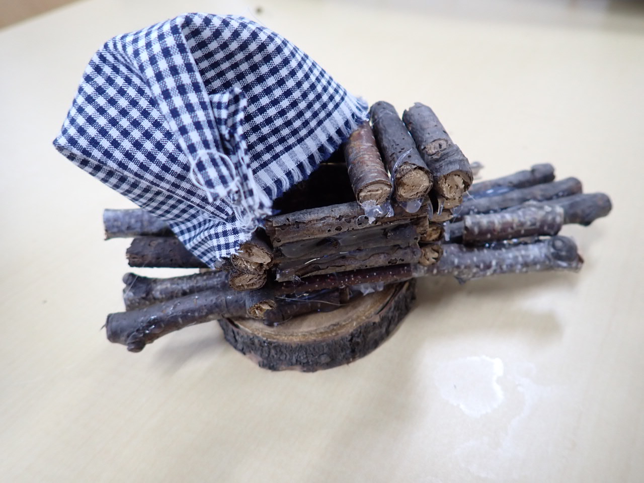 「船をつくる」と考えてきてくれて、枝を切って積み上げて作った船。