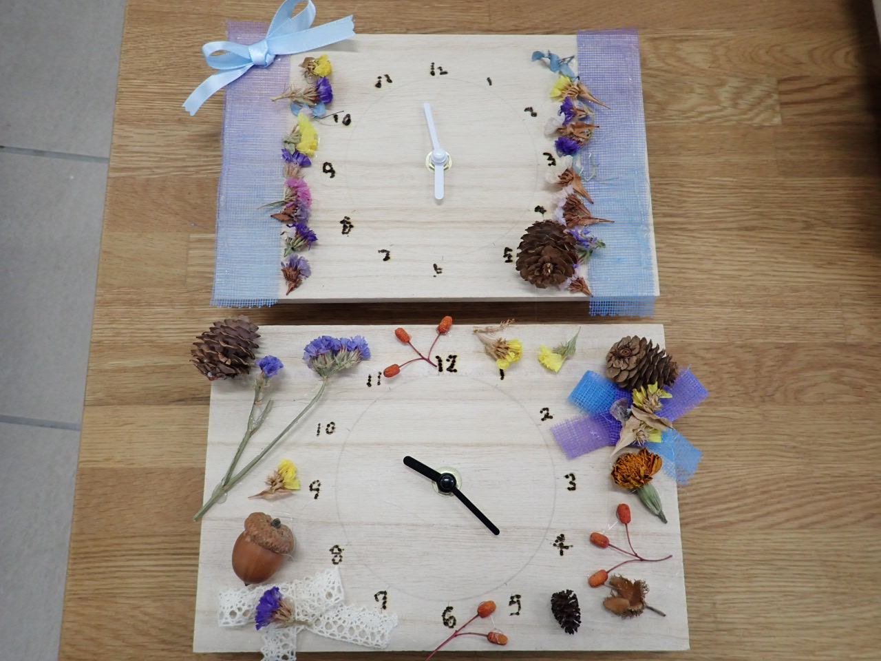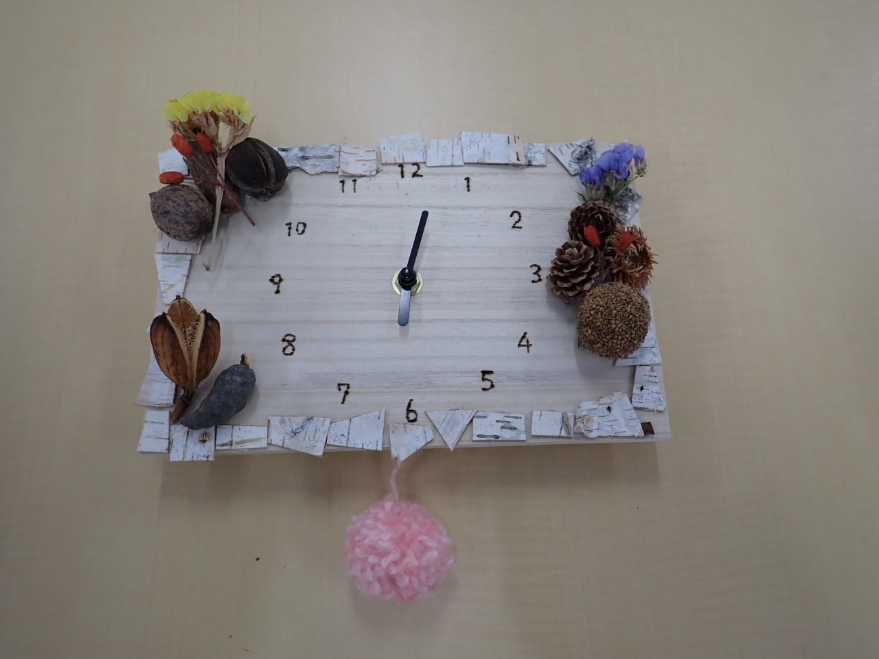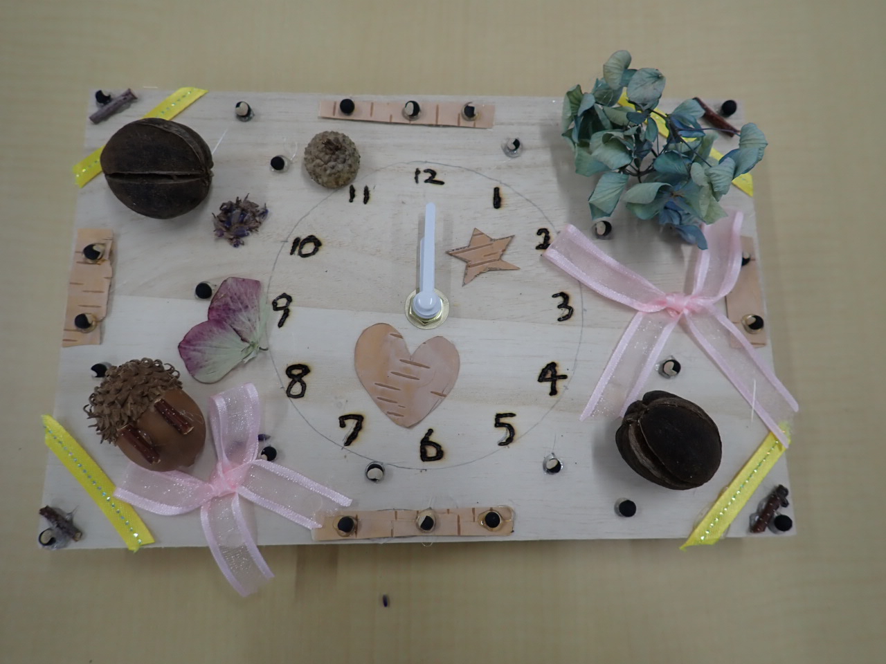 木の実やお花、白樺の皮、リボンで飾り付けをしたあとは、時計の針をつける作業に