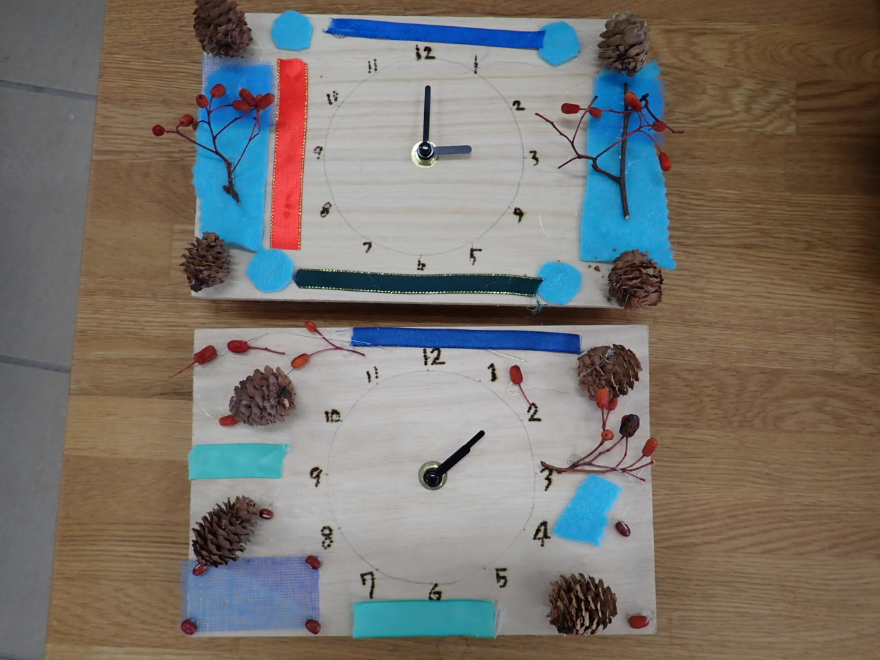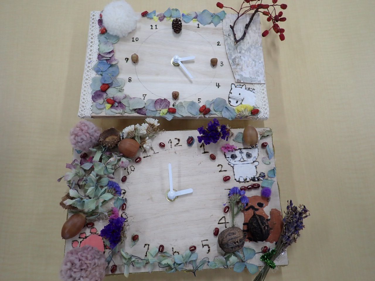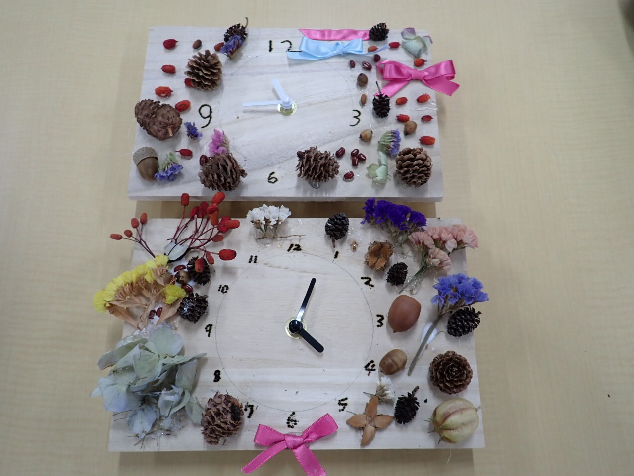 木の実やお花、白樺の皮、リボンで飾り付けをしたあとは、時計の針をつける作業に