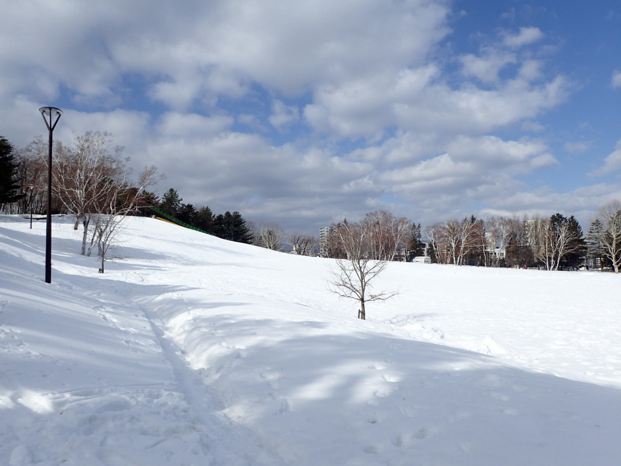家の周りの道路は、ほとんど雪が溶けていますが、月寒公園の園路は、