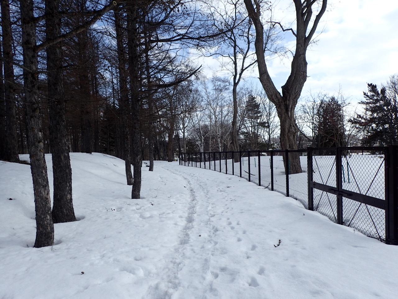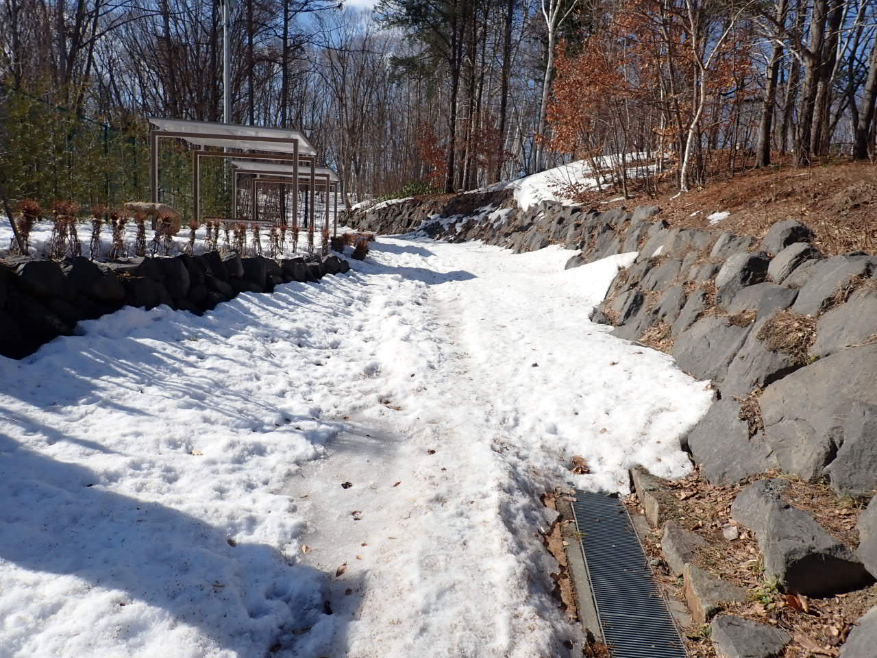 こちらはテニスコートの前の道です。まだまだ雪が残っていて園内の散策は