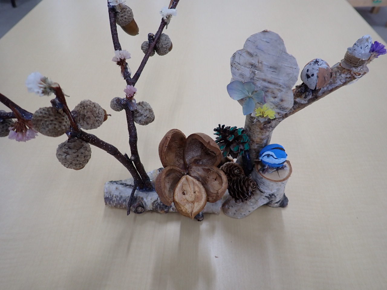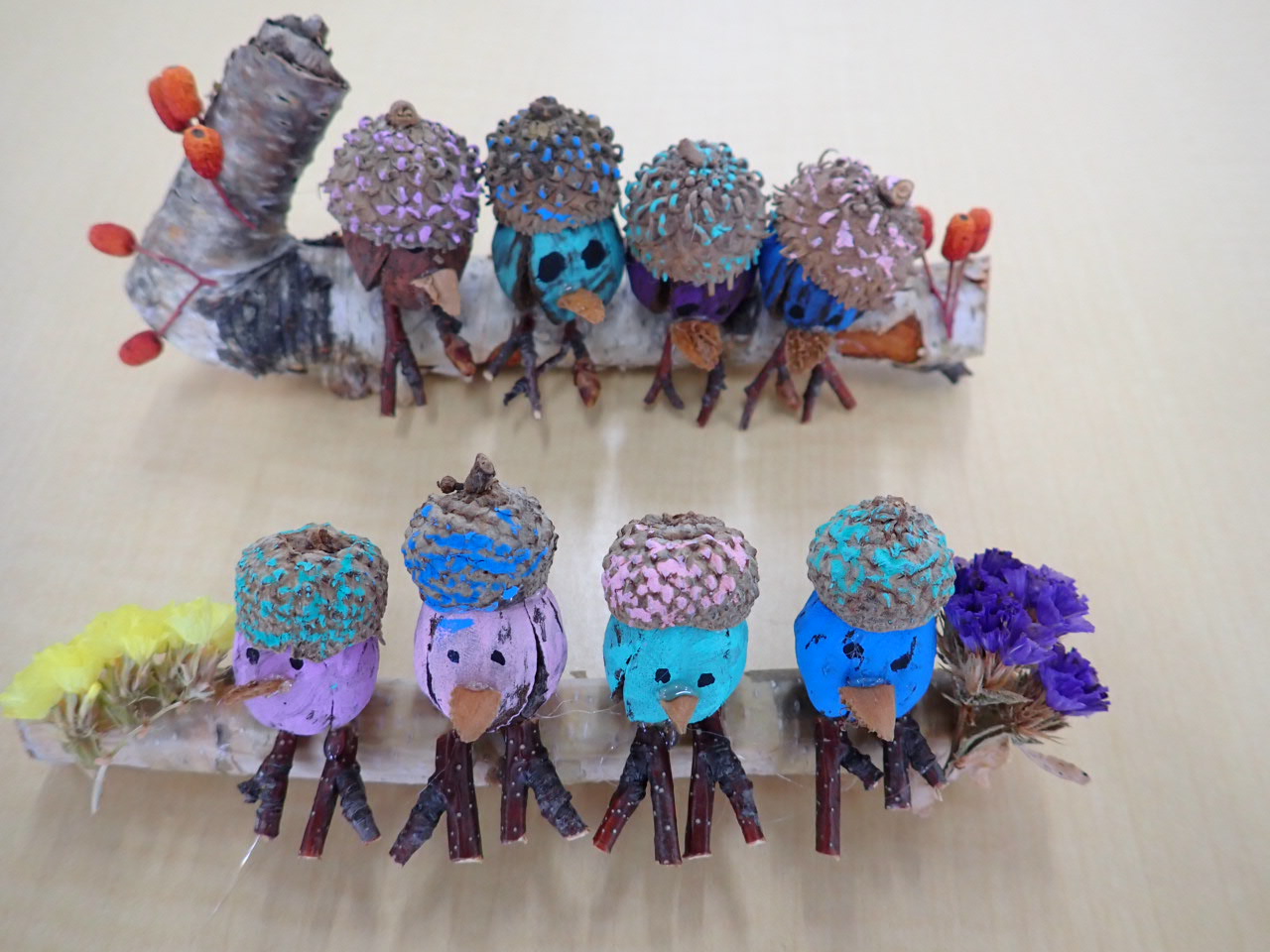 長さ10cm位の木の枝に木の実で小鳥をつくって並べたり、木の実や松ぼっくりで