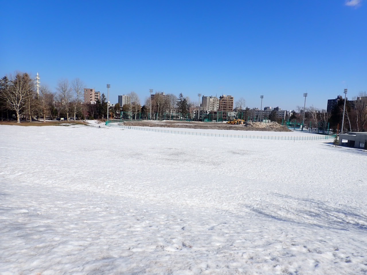 月寒公園の雪解けも進み、多目的広場はまだ雪解けの水はありますが