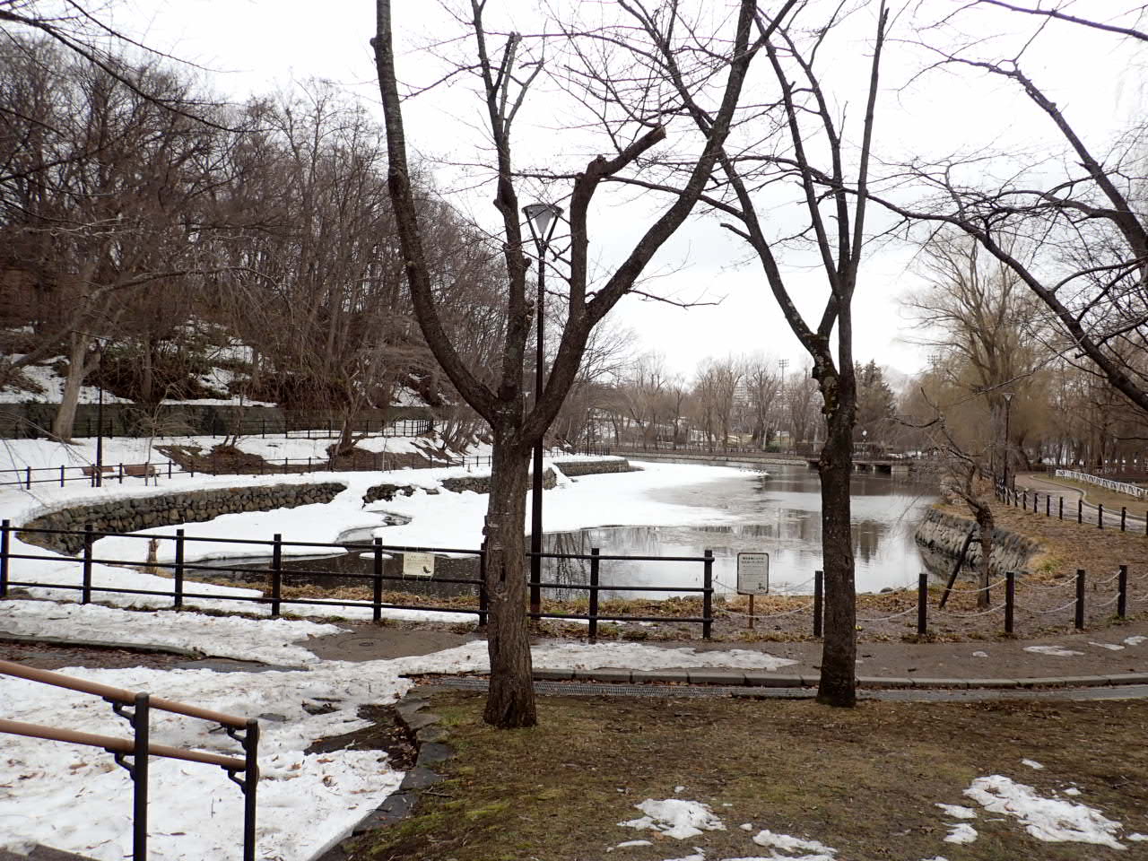 ボート池の周りも日向の部分は雪がなくなってきました。住宅街に