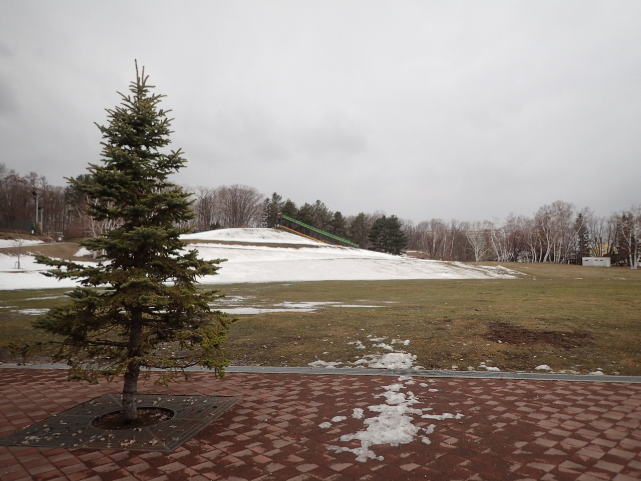 そり滑りで人気の多目的広場は雪解けが進み、少しずつですが