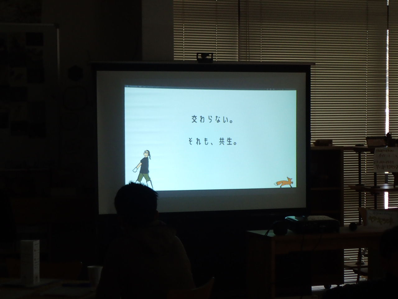 人がエサをやることで、キツネが人に慣れて距離が近くなり、エキノコックス症のリスクも高まります。また、キツネ同士の距離が近くなることで、疥癬などの病気も移りやすくなってしまいます。池田先生からは、キツネをはじめとする野生動物との「共生」についても、投げかけられ、参加者それぞれがキツネとの関わり方を考える機会になりました。
