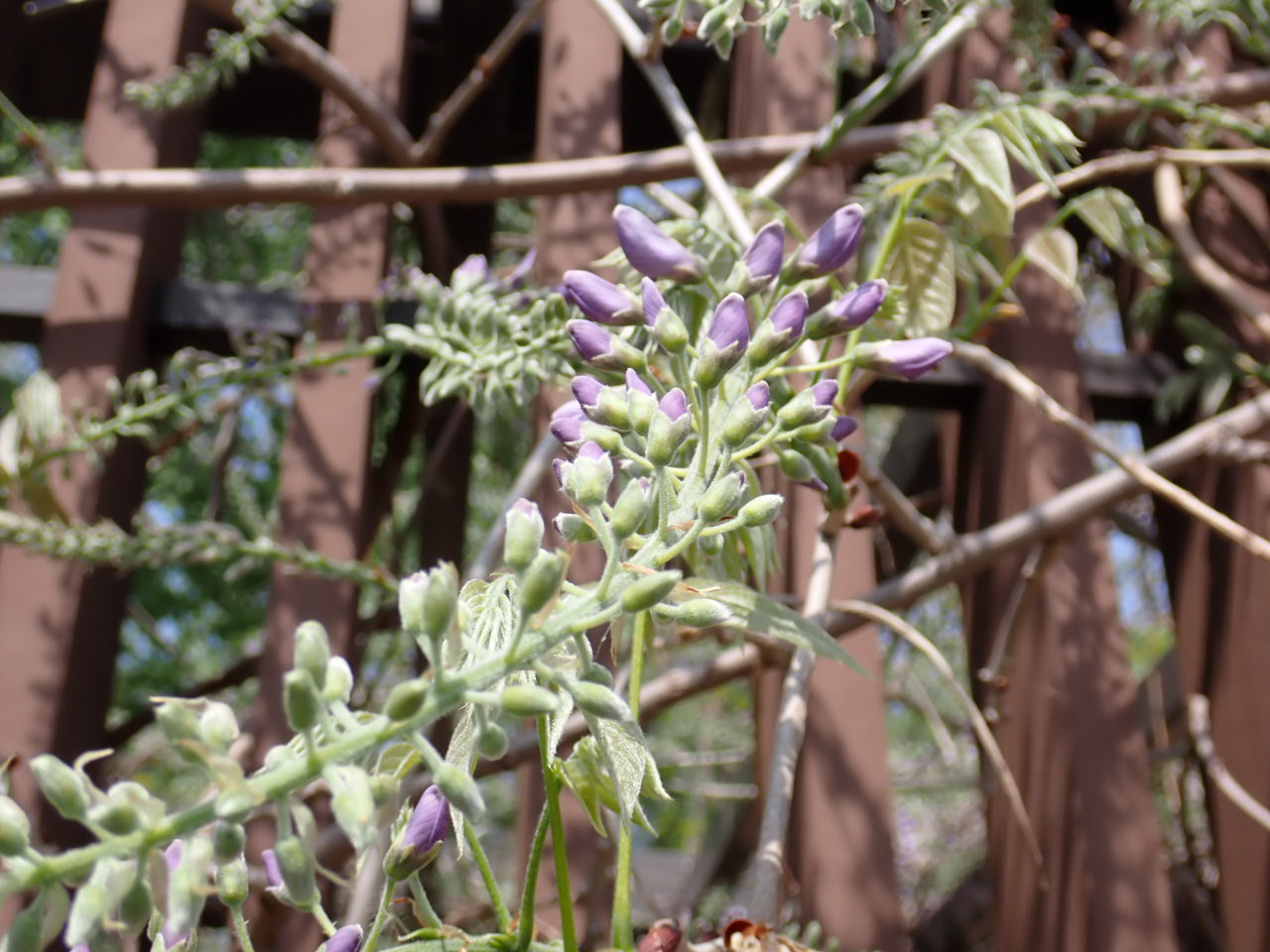 ボート池の藤棚の藤の花が開花しました。薄紫色のブドウの房のような花がたくさん
