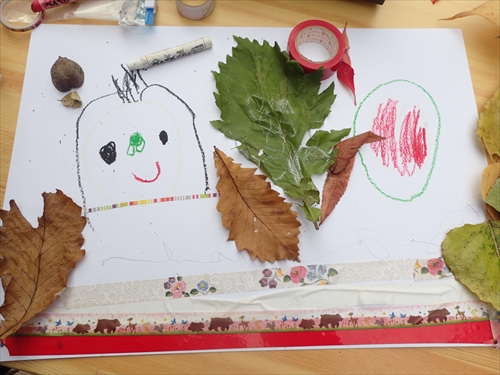 最後は、集めた葉っぱや木の実を使って、大きな画用紙にお絵描きしました。