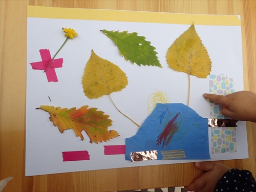 赤や黄色、緑色の葉っぱ、大きな葉っぱに小さな葉っぱ、お気に入りの葉っぱで素敵な作品が完成しました!