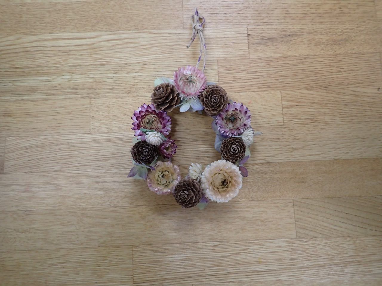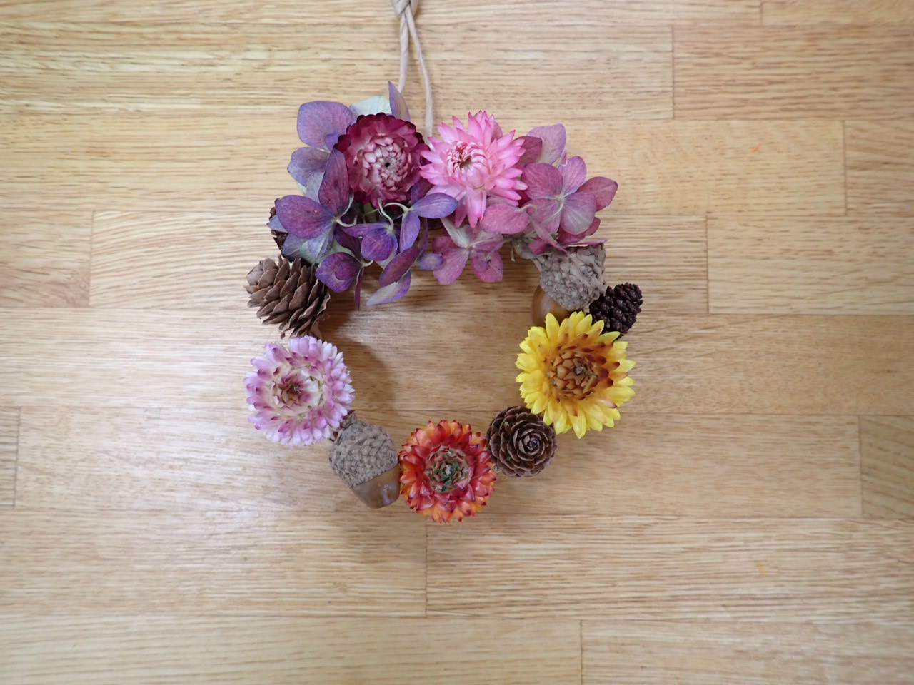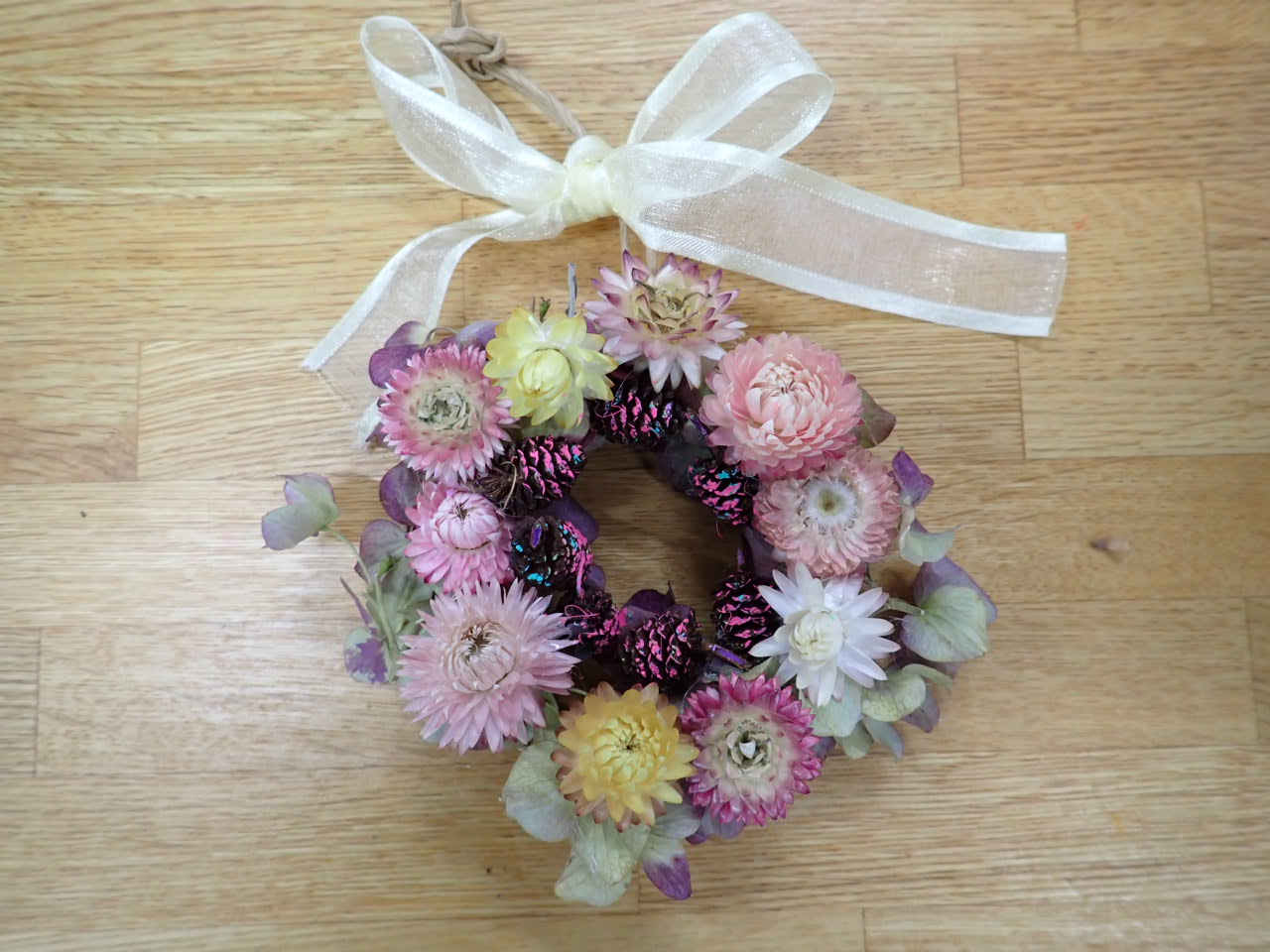 花壇に植栽していたヘリクリサムのお花をメインにみなさん素敵な木の実とお花の
