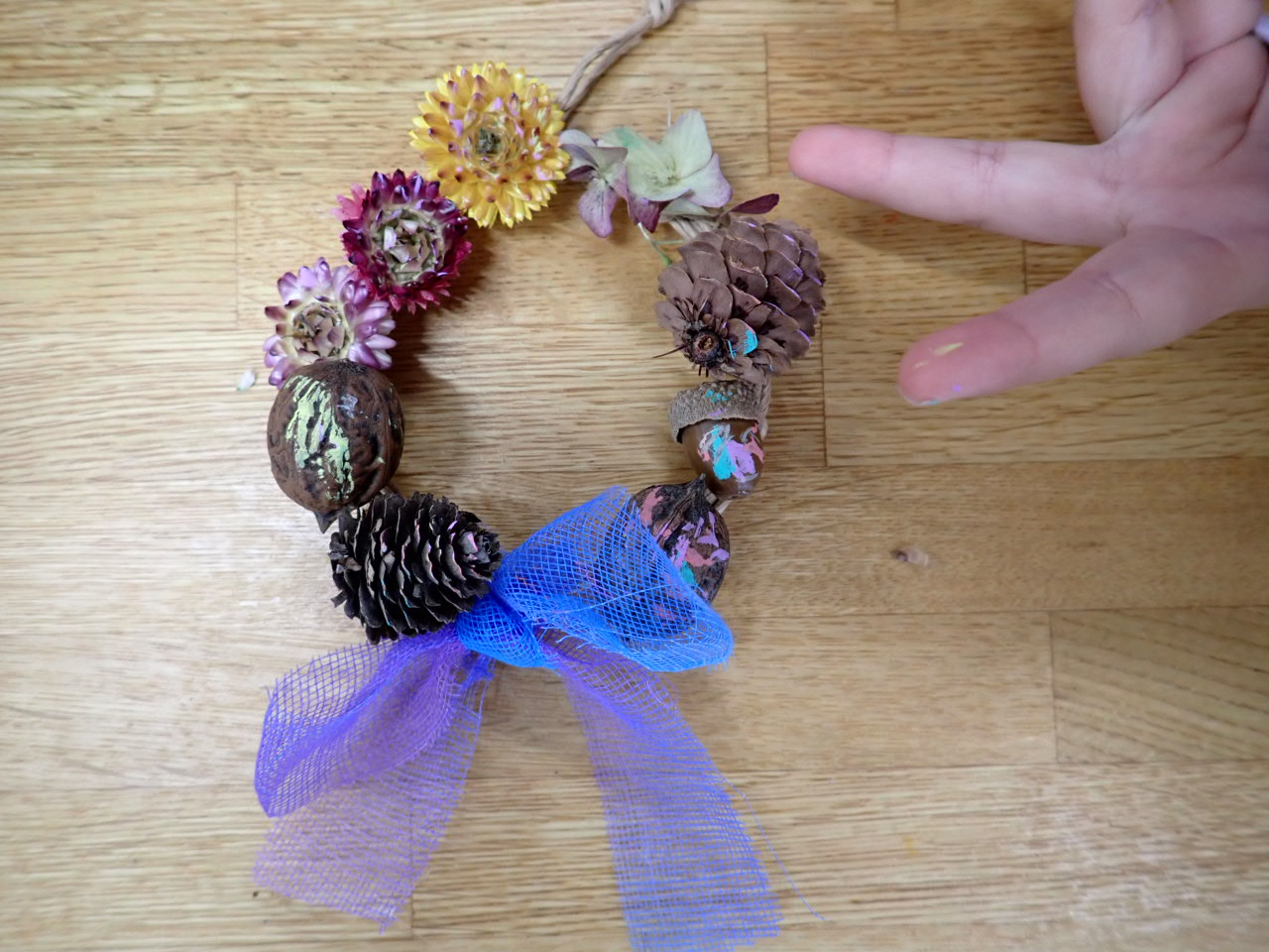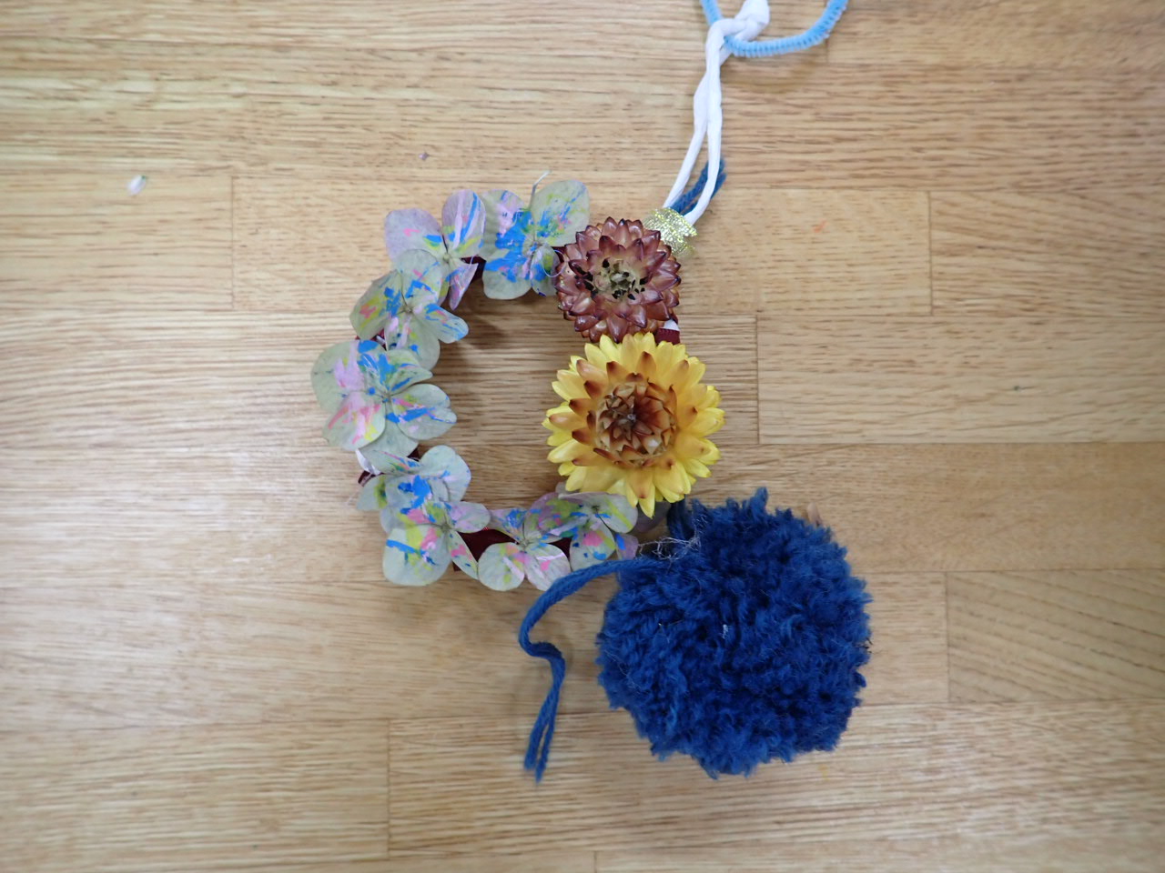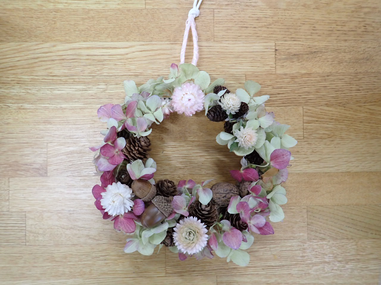 花壇に植栽していたヘリクリサムのお花をメインにみなさん素敵な木の実とお花の