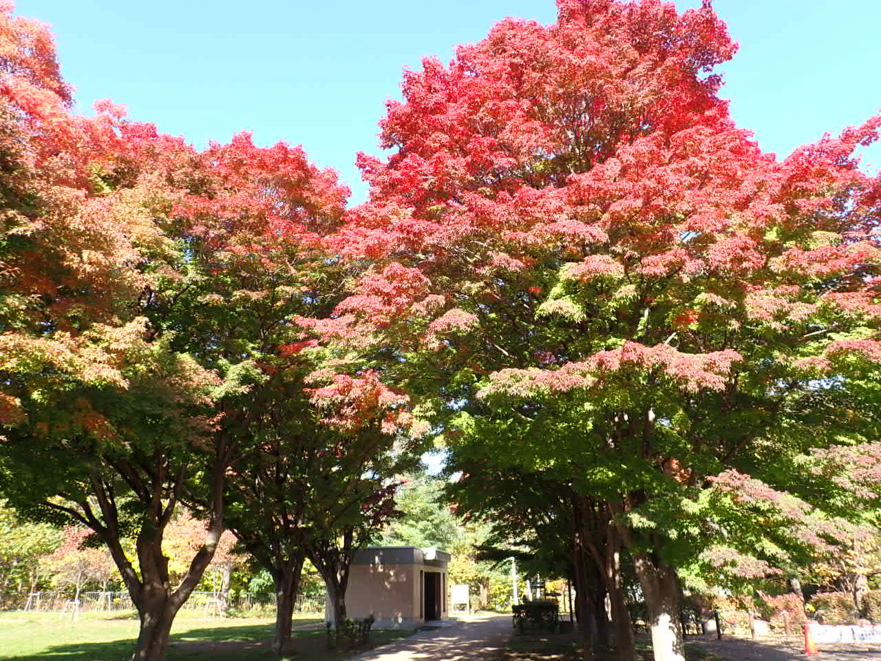 月寒公園の紅葉は見頃をむかえ、赤や黄色がさらに色濃くなってきました。