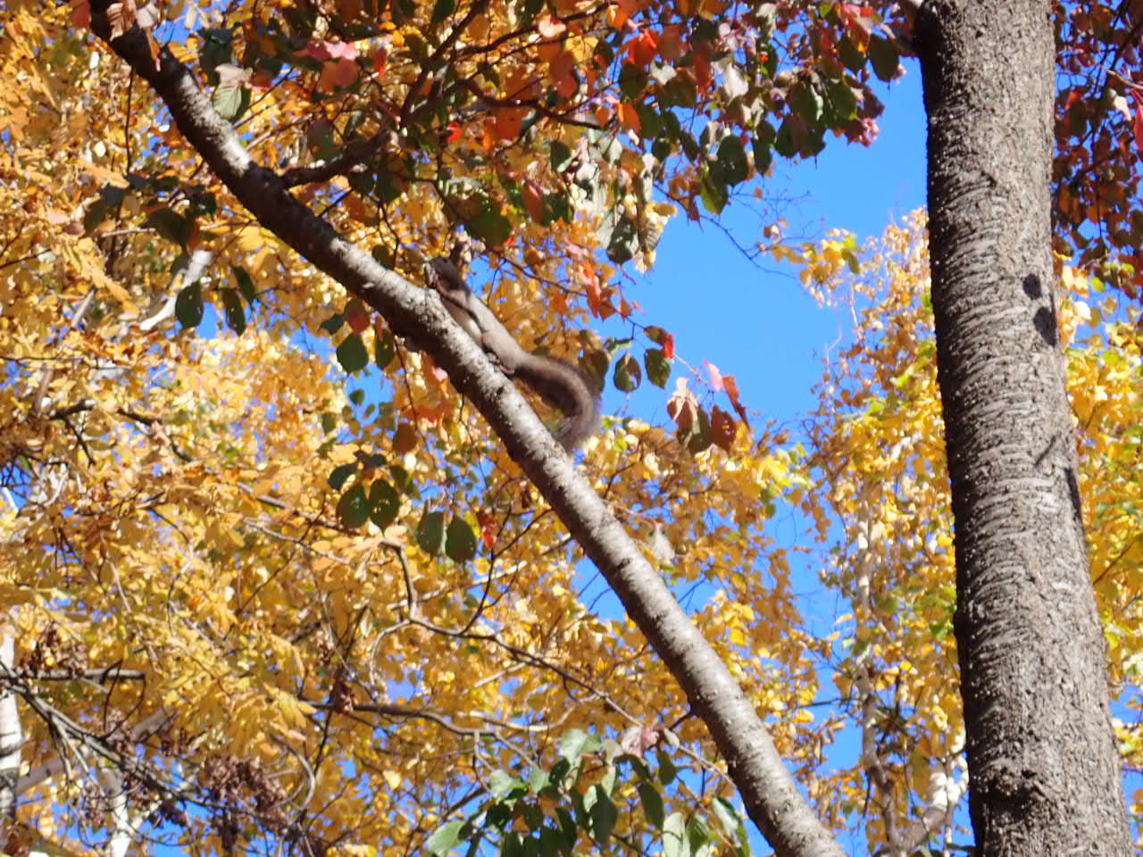 赤や黄色に紅葉した木々の中を忙しそうなエゾリス