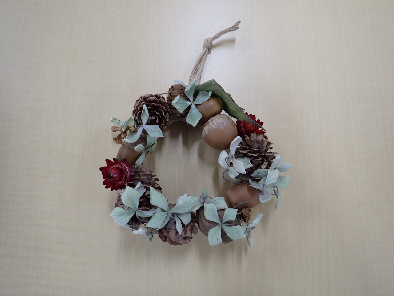 「ミニリース」。公園の自然素材の木の実やアジサイのお花を使って、秋のミニリースを