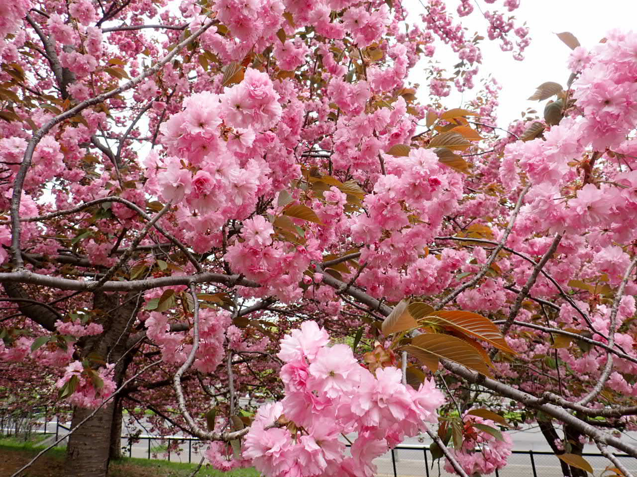 羊ヶ丘通りからみえるパークゴルフ場の横ではヤエザクラが満開です。