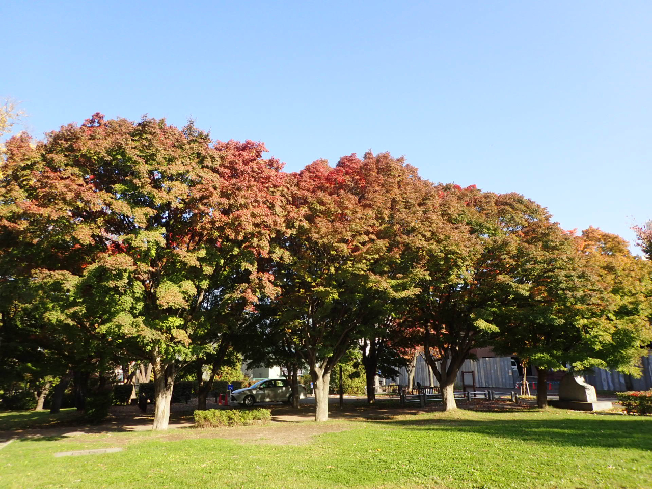 毎年、晩秋に真っ赤な紅葉がみられる月寒神社近くの身障者駐車場横のモミジは