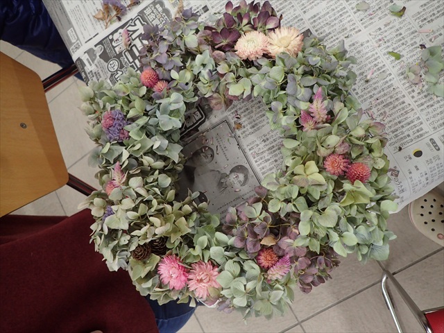丸いリースにアジサイを繊細にあしらって、かわいいリースを作る方・・・・・・