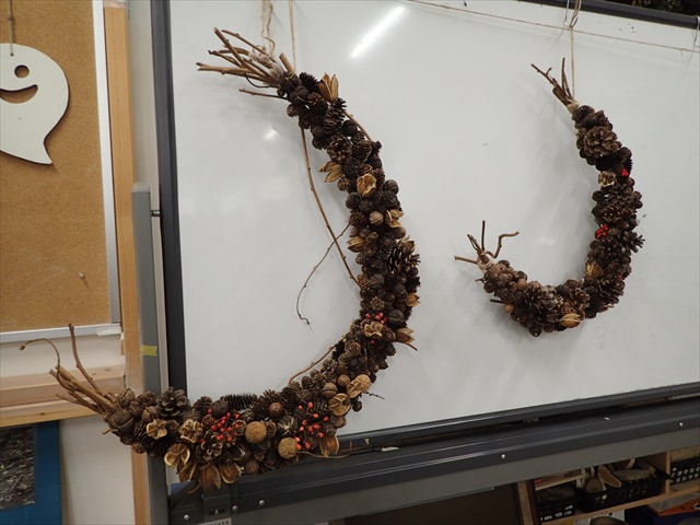 三日月の大きいリースに、木の実をたくさんつけて、豪華なリースを作る方、