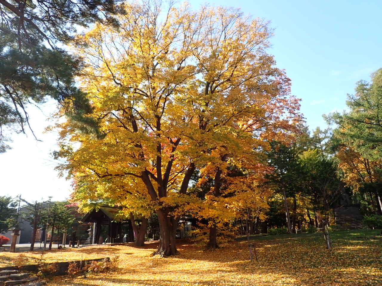 月寒神社横の大きなカエデの木が紅葉し、黄色の絨毯が!