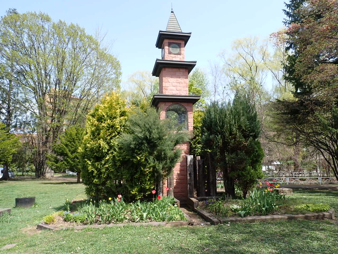 時計塔花壇ではチューリップとヒヤシンスが咲いています。