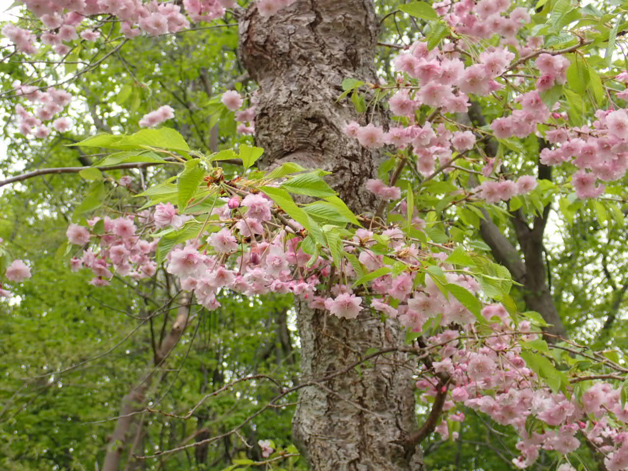 園内のエゾヤマザクラは、少しずつ散り始めていますが、ボート池周りのシダレザクラは、咲き始めています。
