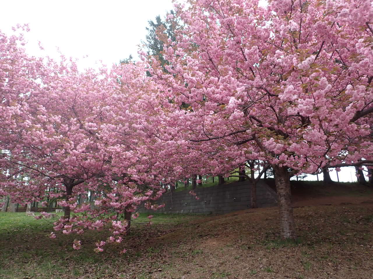 羊ケ丘通に面しているパークゴルフ場の横でヤエザクラが見頃です。