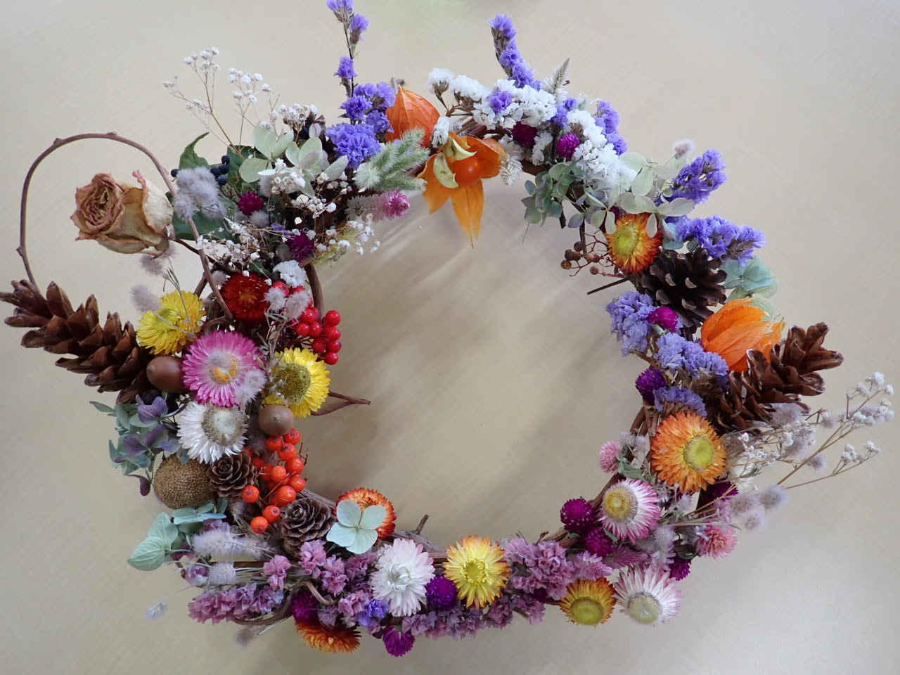 昨年参加してくださった方のたくさんのお花と木の実を組み合わせて使ったリースです。