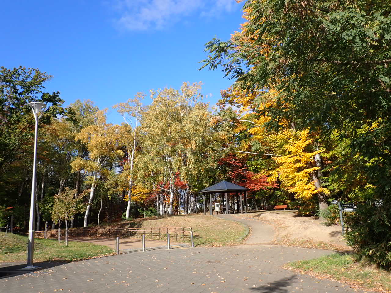 高台野球場向かいにある「散策の森」も、木々が赤や黄色に紅葉して、