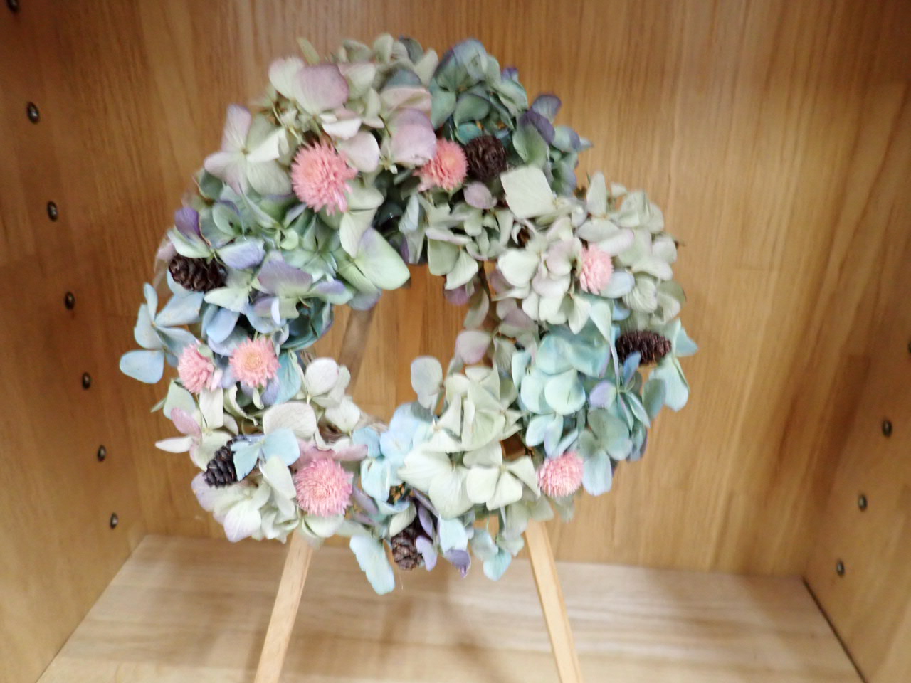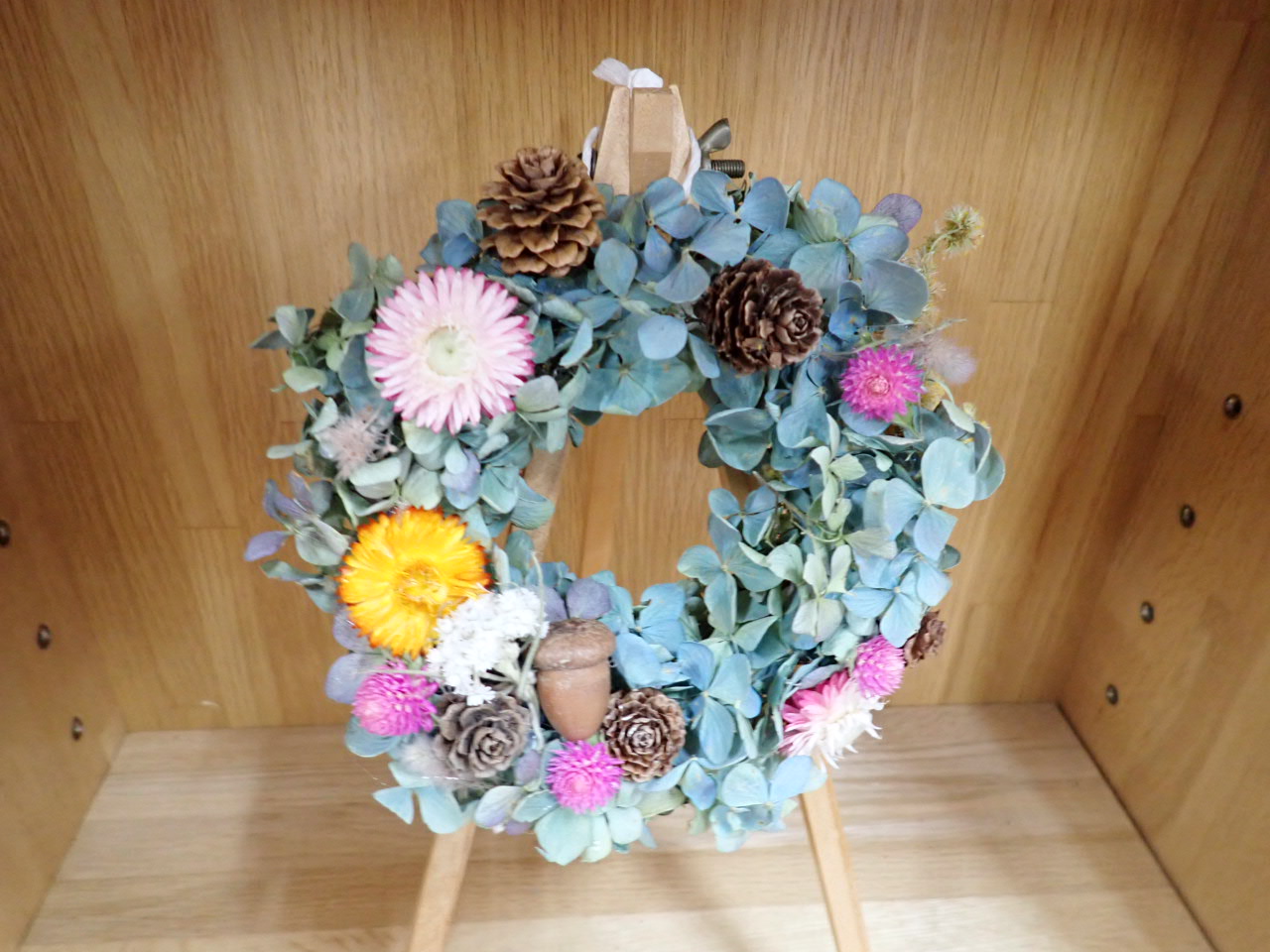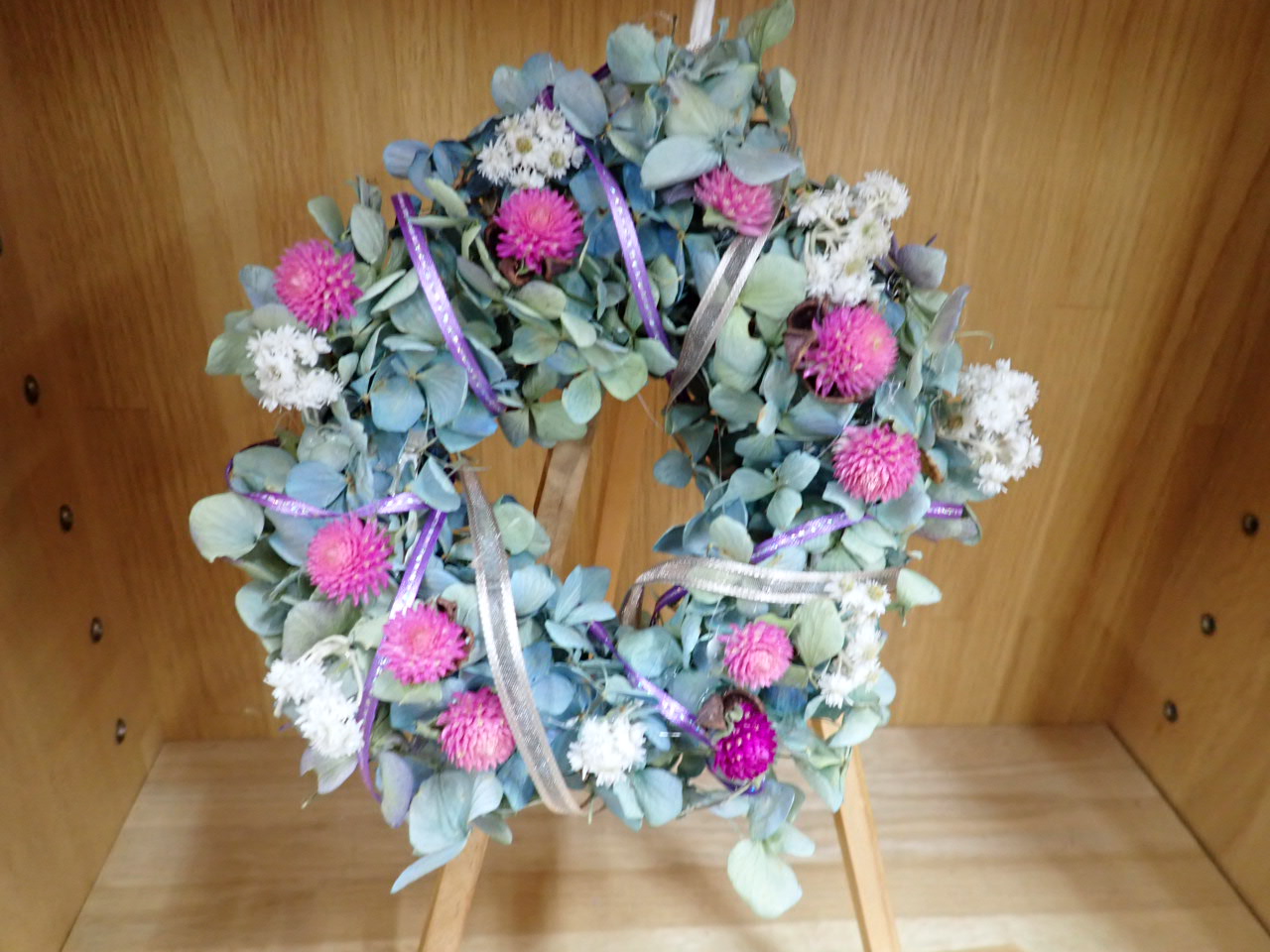 直径12センチほどのリース枠にアジサイやヘリクリサム、センニチコウの