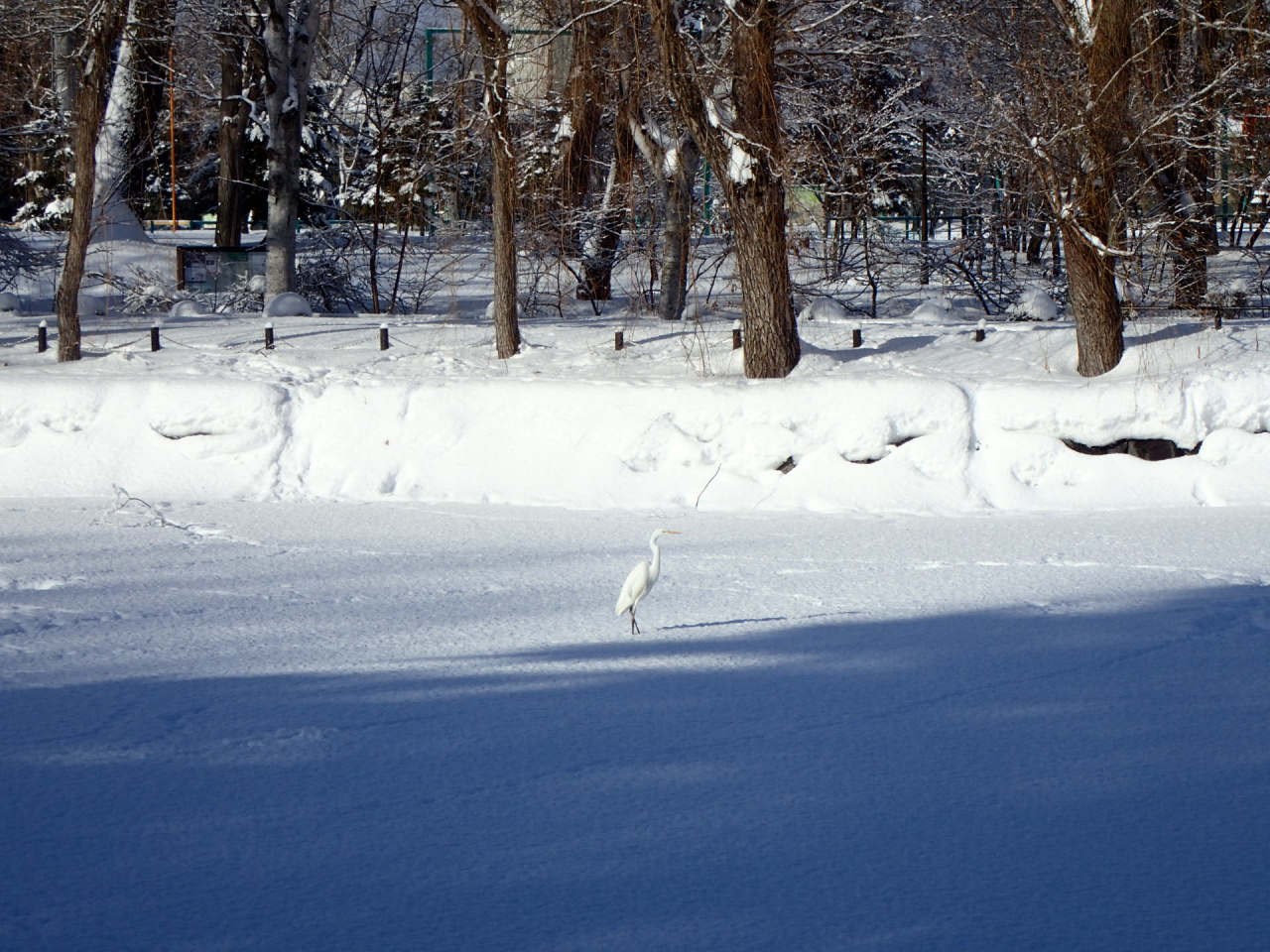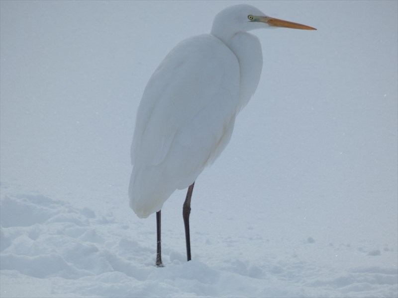↑白い雪の上に佇む白いダイサギ、見つけられますか?