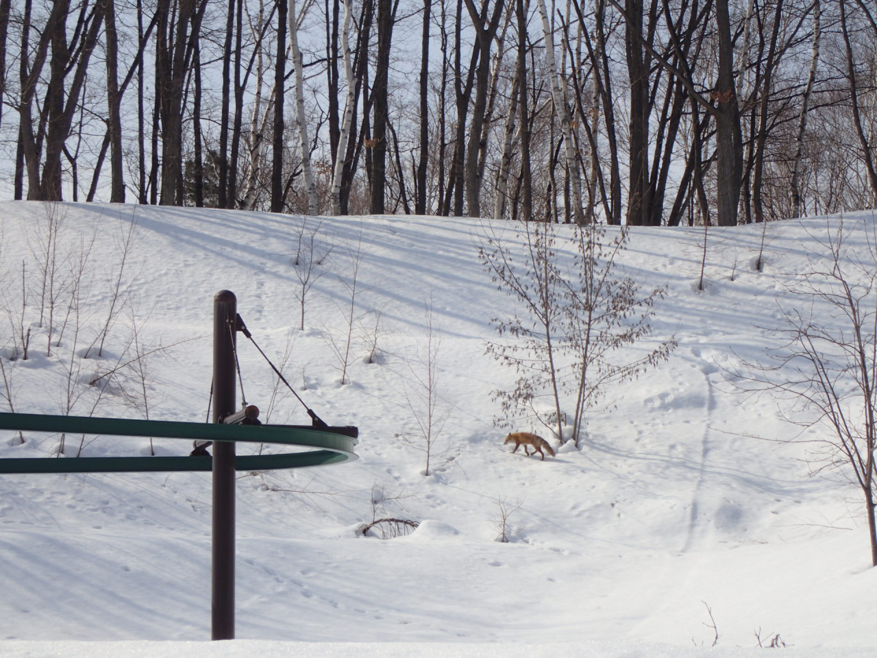 この日は、パークゴルフ場の裏で、巣材を運ぶエゾリスに出会ったり、穴を掘っているキツネを見かけたり、野生動物にたくさん出会いました。