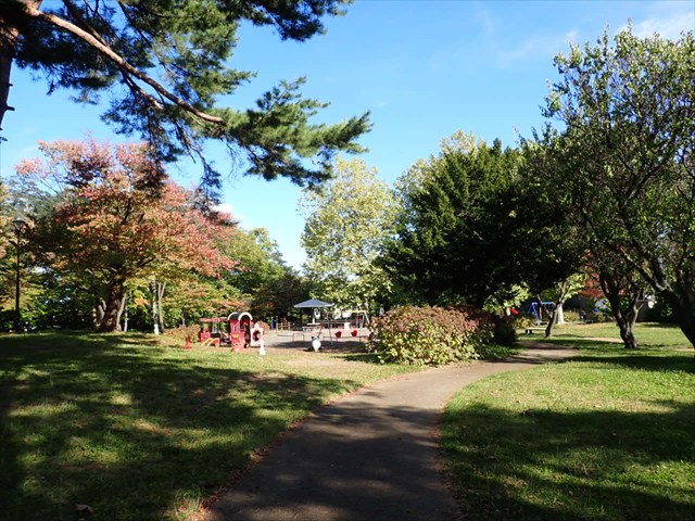 写真はこどもひろばの様子。赤いSL遊具の横にあるエゾヤマザクラが赤く色づき始めています。