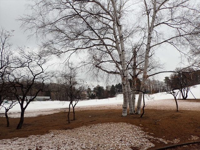 札幌市内の積雪は0㎝に近づいているようですが、月寒公園はまだまだ雪の中。