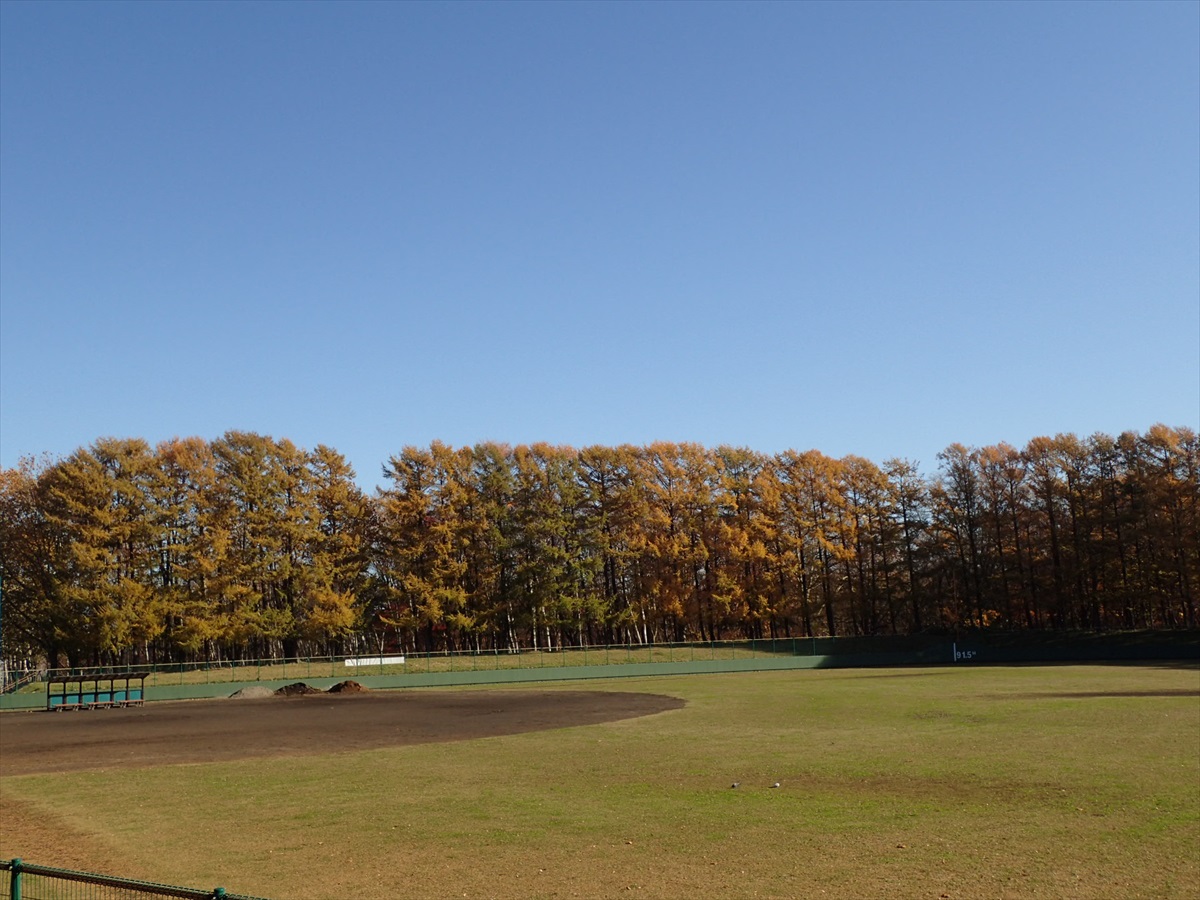高台野球場の外周は、カラマツの並木になっているので、これから冬の始まりにかけて、