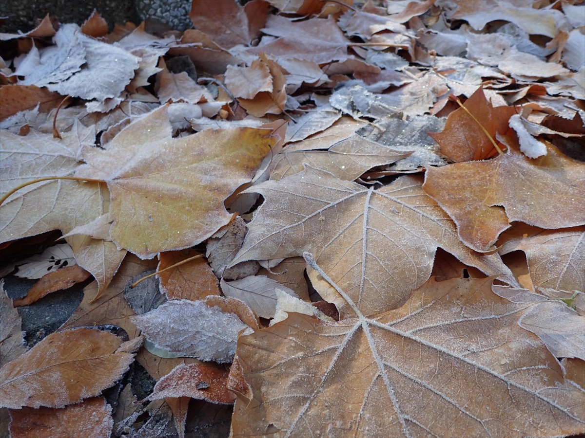 霜は、空気中の水蒸気が冷やされてできる氷の結晶を差すそうで、霜をまとった落ち葉は、とても美しいですね。