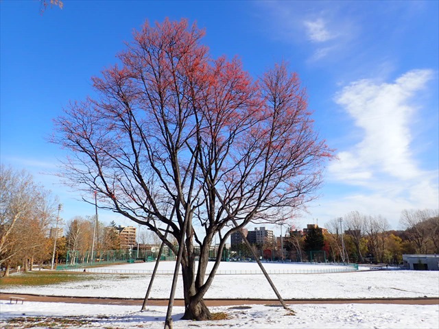そんな中、多目的広場の片隅ある「アズキナシ」の木は、真っ赤な実をたわわにつけています。燃えるような赤い木と、真っ青な空、白い雪が、今日はとてもきれいに見えました。