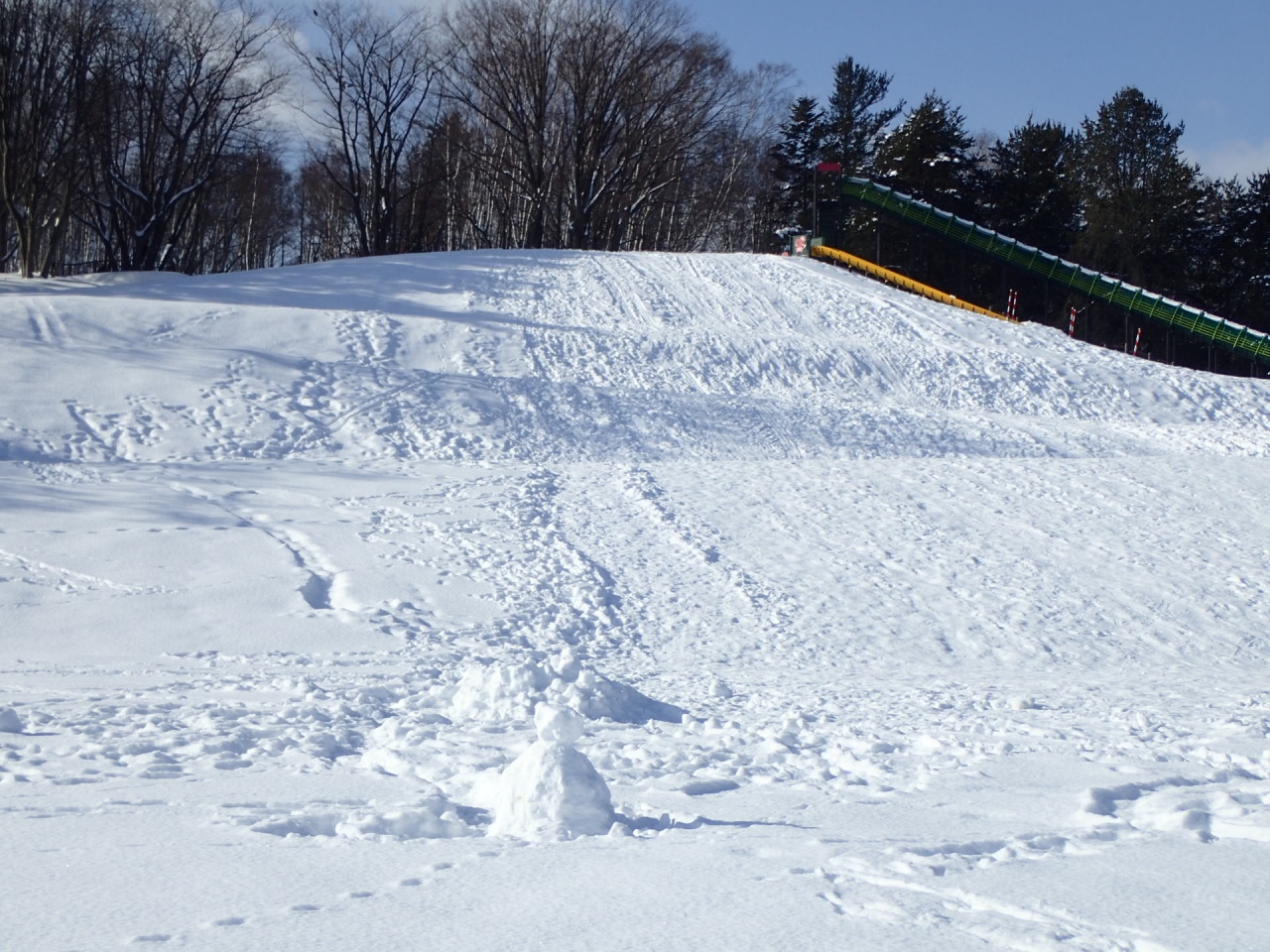 斜面に近いところに作られた雪だるまやかまくらは、そりすべりの際にぶつかって