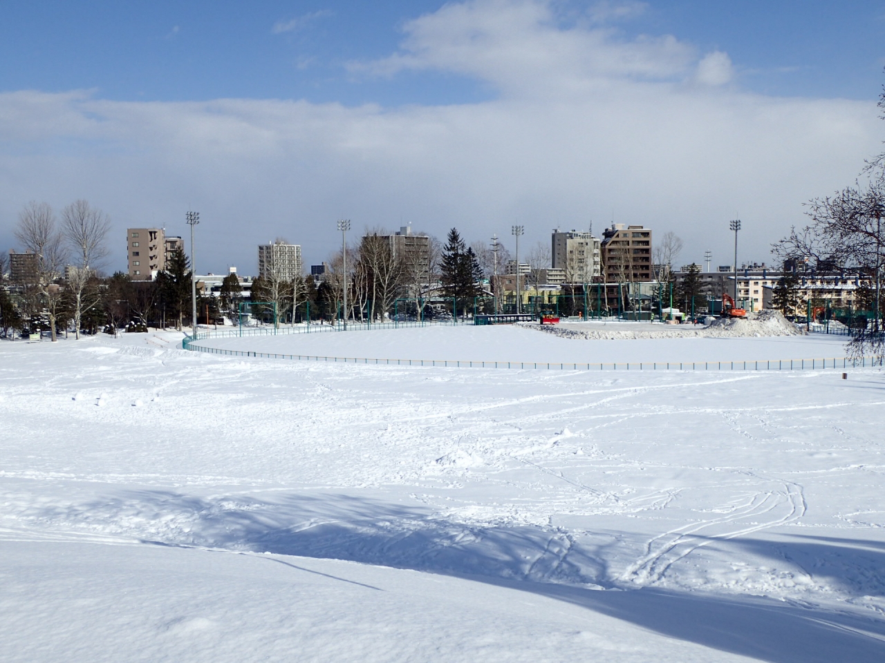写真は、今日の多目的広場の様子です。たくさんのそりすべりの跡がついていますね!