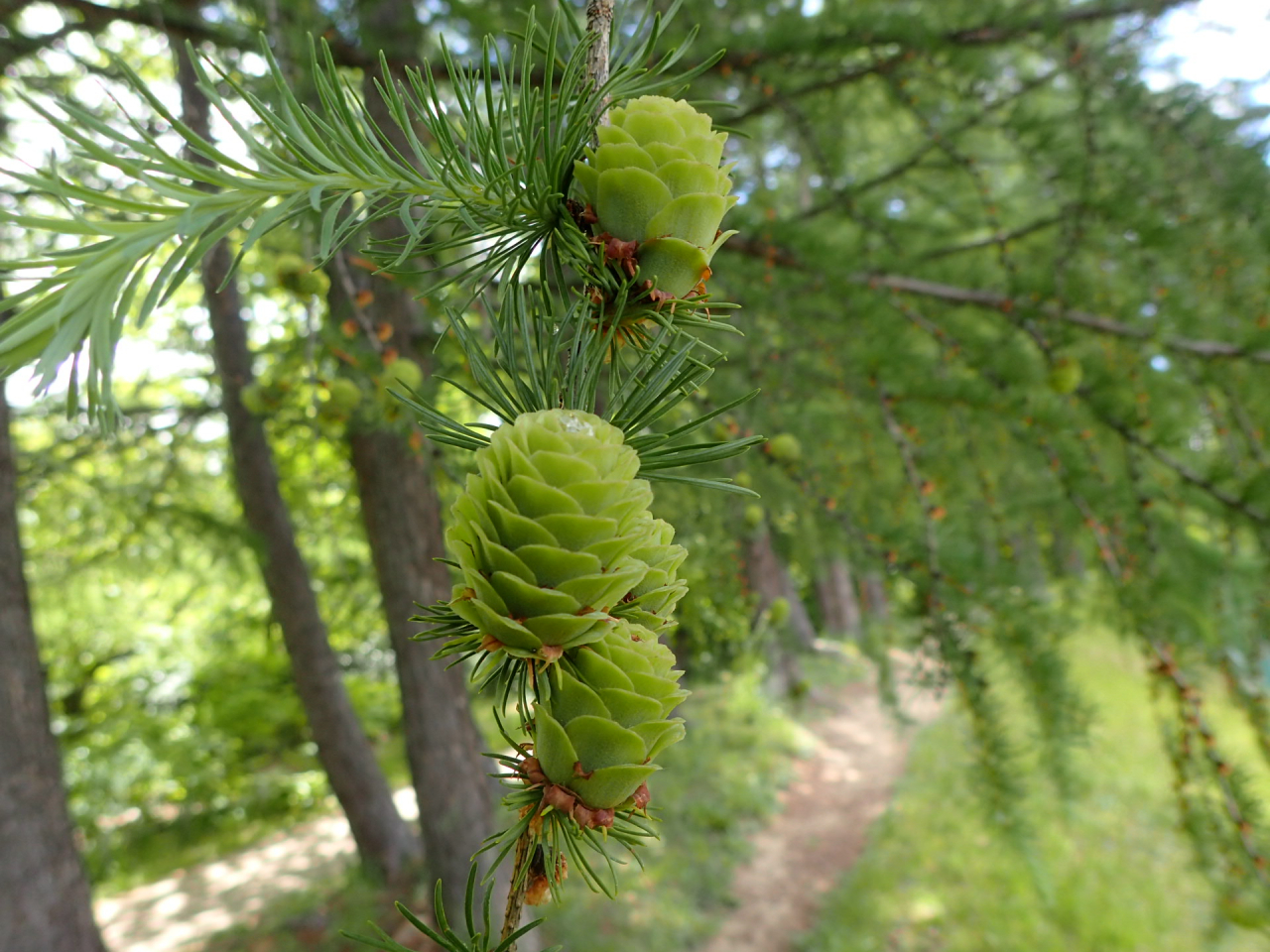 今日歩いていたら、カラマツの木に緑色の松ぼっくりが付いていました。