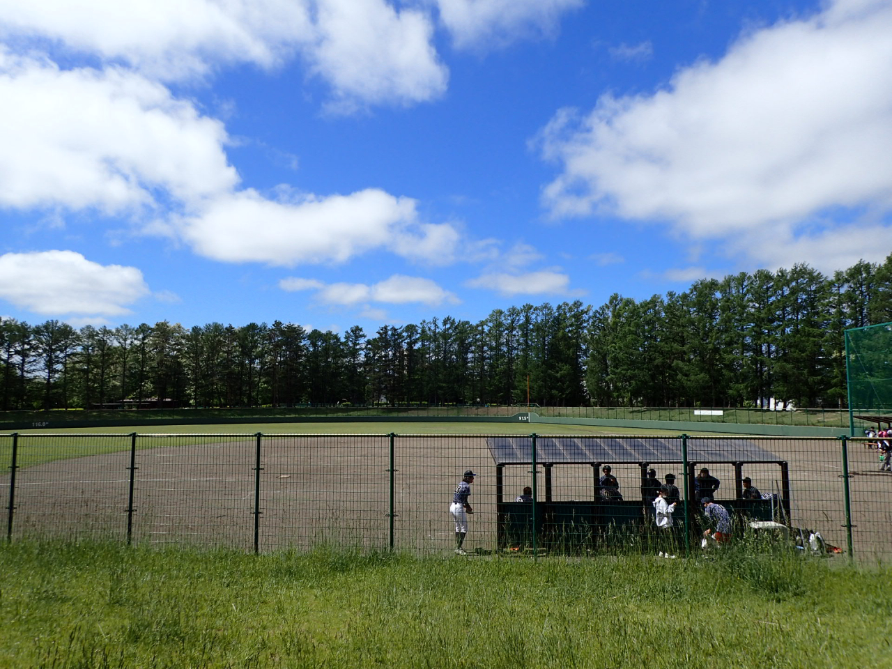 一方高台野球場は、カラマツ並木に囲まれた高台にある球場です。