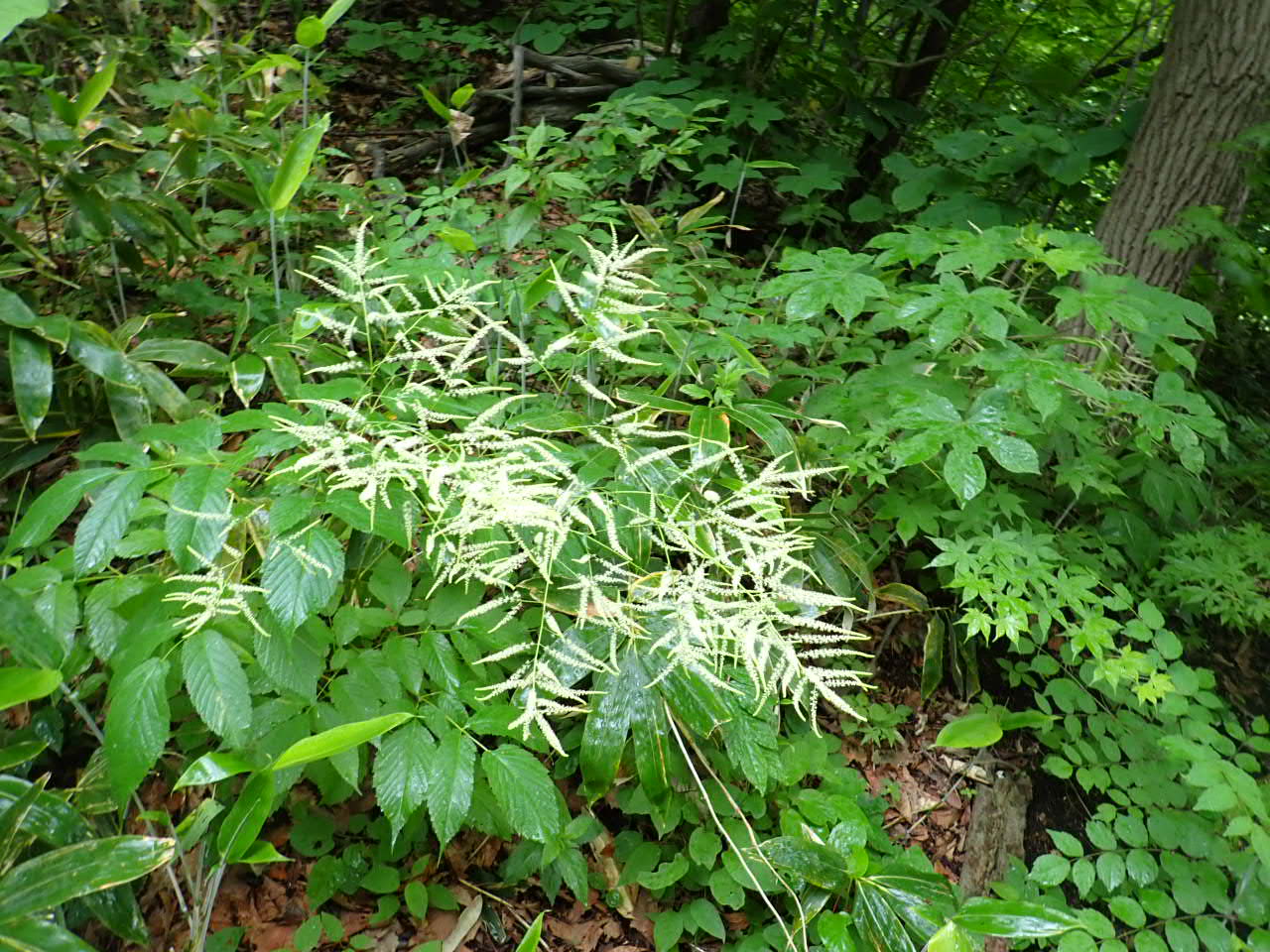 月寒神社に向かう階段沿いでは、ヤマブキショウマが見ごろです
