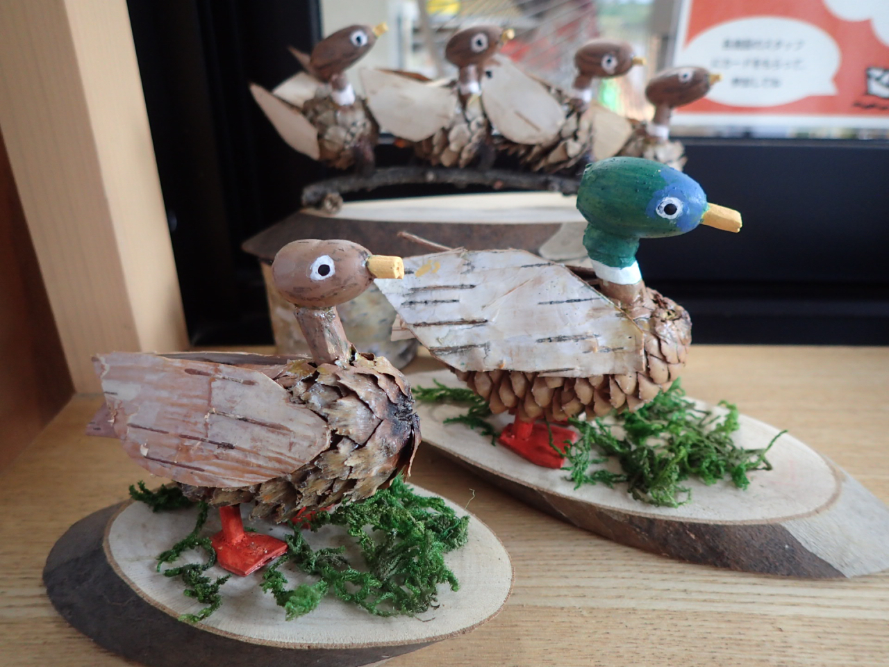 ↑ボートスタッフお手製の、木の実で作ったマガモたち。秀逸かつ、かわいい!