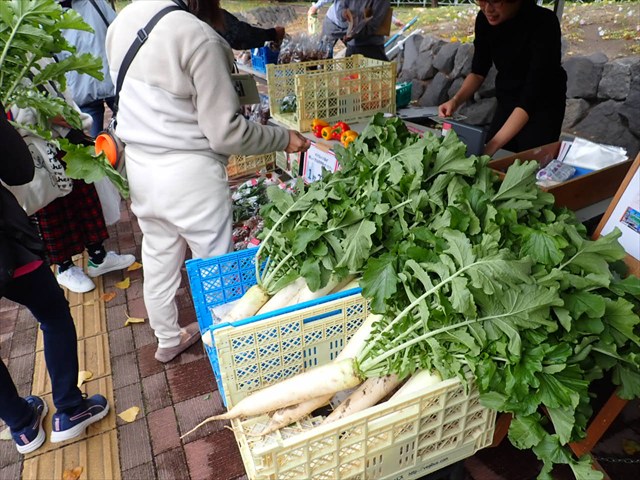 この時期のお野菜と言えば、じゃがいも、にんじん、大根でしょうか。YUMEYASAIさんは、いつも旬のお野菜を色々持ってきてくれるので、楽しみですね。高橋ファームさんの干し芋や壺焼き芋や、しいたけファームさんの椎茸も、根強いファンが多い絶品のお野菜です。