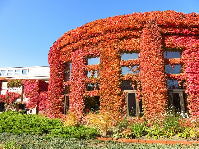真っ赤に紅葉した大きな木?…ではなく、なんとツインキャップのツタ!